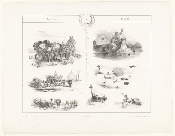 Curator: Let's consider this fascinating print by Victor Adam, created in 1839. The full title translates to "Two representations of bad things and two representations of good things in life." It resides here at the Rijksmuseum, offering a comparative glimpse into perceived fortune and misfortune through the lens of 19th-century eyes. Editor: My immediate impression is one of stark contrast. The compositions are busy, detailed. There's a flurry of ink strokes, depicting action, mostly centered around men hunting. It seems deliberately constructed to highlight opposing experiences. Curator: Precisely! Examining the material choices – ink on paper – highlights printmaking as a means to disseminate such moral comparisons widely. Consider the implications of mass-produced morality plays aimed at a burgeoning middle class. Adam worked as an illustrator and lithographer, these skills certainly came to hand to promote these themes to a larger audience. Editor: Let's delve into the symbolism. On the "bad" side, we see a huntsman alone on horseback in a wintry scene, and figures crouched, nearly submerged, in what appears to be a swamp. Those postures evoke a sense of isolation, perhaps struggle. Whereas the "good" side portrays a triumphant rider and men collaboratively hunting from a boat. Curator: The social context is crucial. Hunting, then, was more than just sustenance; it represented power, leisure, and camaraderie, particularly for the privileged classes. Adam subtly critiques or reinforces class divisions depending on your point of view, showcasing how even leisure activities could be sources of inequity or, in the other scene, an opportunity to spend valuable time with one’s peers. Editor: The wintry setting on the "bad" side evokes harsh conditions, reflecting challenges and adversity. The "good" side depicts calmer waters, easier circumstances. Hunting itself becomes a metaphor—a life of difficulty versus one of relative ease. The repetition of those scenarios allows those with very little to find themselves within this picture as well as others who have means of getting away. Curator: Right, the image acts almost as a moral barometer. By dissecting the scenes and their construction, we reveal the value systems at play. Even the labor invested by Adam speaks to this—a carefully rendered print, intended to educate and guide conduct through readily accessible imagery. This was no easy piece to undertake or view. Editor: And that duality, played out through easily understood iconography—weather, landscape, communal activity—makes it incredibly compelling even now. We recognize these symbols on a very human level and they persist across decades and boundaries to highlight the challenges in life and the value of good fortune. Curator: I agree, and focusing on the materiality of the print, we begin to understand how art like this could serve as both a reflection of societal values and a subtle tool for social commentary. Editor: The balance is truly amazing when we realize it allows the mind to explore these ideas.