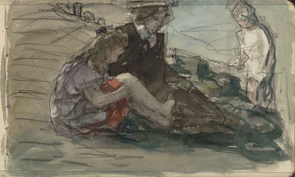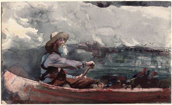 Editor: This is "A Woman in a Boat at the Pier" by Albert Edelfelt. It's difficult to nail down the exact date but appears to be rendered in oil paint, and maybe watercolor too. It has such a light and airy feel to it. What elements really stand out to you? Curator: For me, it's all about the visible brushstrokes. Edelfelt isn't just depicting a scene; he's revealing the very labor involved in its creation. Notice how the application of paint, particularly in rendering the pier and the sails, breaks down the illusion of reality, reminding us of the materiality of the piece. What social forces are present? Editor: Social forces? It feels so isolated and quiet. I wouldn’t have thought of social commentary here. Curator: Consider this was painted during a period of significant social change and growing industrialization. The scene presents a woman engaged in perhaps leisure, which was made possible, at least for some, by specific socioeconomic structures. How do the materials themselves reflect or reinforce these social realities? For example, the relative ease and cost-effectiveness of plein-air painting tools made artistic representation of leisure accessible for rising demographics. Editor: That's interesting. So, even the materials—paint, canvas, brushes—and the method of painting outdoors connect to class and accessibility? The ease of creating art contributes meaning in itself. Curator: Precisely. We often separate 'high art' from everyday craft, but looking at the means of production helps us to see them as part of the same continuum. Edelfelt wasn't just creating a pretty picture. His choice of materials and method speaks to a whole system of labor, leisure, and consumption. How has thinking about the painting through materiality changed your initial impression? Editor: It's definitely less "airy" now and more grounded. I see the connection to a wider world beyond the woman in the boat, one tied to social and economic systems that were essential to the making and the content of the art. I’ll never look at Impressionism the same way! Curator: Good. We always see through layers of the world to reach new meanings, which adds to our cumulative understanding of not just the work but also ourselves and the world.