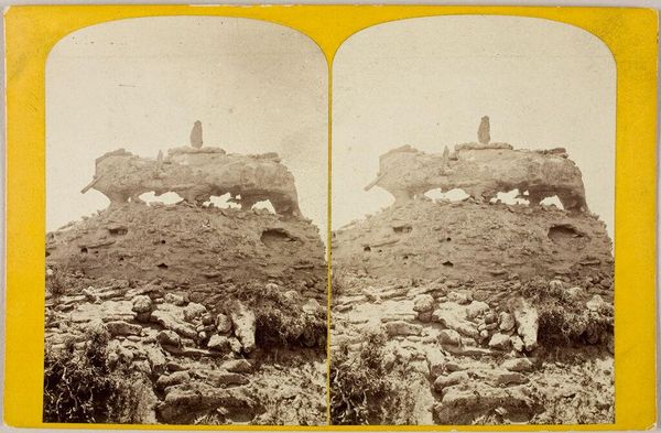 Curator: This is a stereograph by William Bell, documenting the Sevier River Valley south of Gunnison, Utah. Editor: It certainly conveys a palpable sense of isolation. The monochrome palette and distant vista create a mood of stark contemplation. Curator: The composition is intriguing; the sharp foreground rocks give way to the valley and hazy mountains, organized into clear visual planes. Editor: And we should consider the context of 1872—this landscape was undergoing profound transformation due to westward expansion, impacting indigenous communities and ecologies. It is important to acknowledge that these seemingly empty landscapes are not neutral. Curator: Yes, the photograph is imbued with the ideology of Manifest Destiny. The two figures perched on the rocks reinforce a theme of discovery and dominion. Editor: This is a reminder of the violence inherent in claiming "unexplored" territories. The quietness we observe masks a history of dispossession. Curator: Looking at the tonal range and contrasts, I am still in awe of the level of detail Bell achieved with photography. Editor: Which raises questions about whose perspective is privileged. This image serves as a potent reminder of how landscape photography can be both beautiful and deeply implicated in sociopolitical narratives.