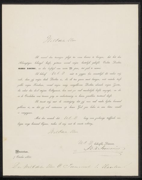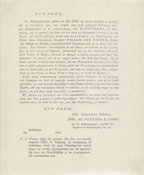 Editor: This is "Overlijdensbericht aan Adriaan van der Willigen," possibly from 1815, by M.C. van Rijndorp. It’s a print – an etching or engraving on paper, with beautiful typography. The script feels delicate and the paper looks aged. What do you see in this piece, beyond the obvious historical context? Curator: I see a powerful intersection of personal grief and public declaration, framed by the rigid social norms of the time. We have to ask ourselves: What does it mean to publicly inscribe a death notice like this? The Romantic style points to a profound engagement with emotion, but one channeled through the constraints of religious expression and familial duty. How might the miniature format further shape the reception of such a sensitive announcement? Editor: I guess it’s a way of making grief official, turning it into a documented historical event? The momento-mori theme makes that pretty clear. Curator: Precisely! And consider who is speaking – M.C. van Rijndorp. The print speaks of the passing of her “dearest Echegenoot” – which seems to translate as “spouse,” while simultaneously mentioning her children. How does the language used frame our understanding of gendered roles and expectations within marriage and widowhood during this period? It isn't merely a personal loss, but also a statement about her social and familial standing. Editor: That's an important point. Seeing it as a public declaration of status shifts my understanding. It's less about raw emotion and more about performative mourning. Curator: Exactly. This challenges us to think about how personal narratives are inevitably shaped and mediated by broader socio-political structures. It also compels us to consider accessibility: Who could read this? Editor: That's true - reading and writing wasn't something that everyone could do. Thinking about how intertwined the personal and the public are is definitely giving me a new perspective. Thanks! Curator: Absolutely, it helps us engage with difficult subjects more deeply and see how that echoes still in contemporary media.