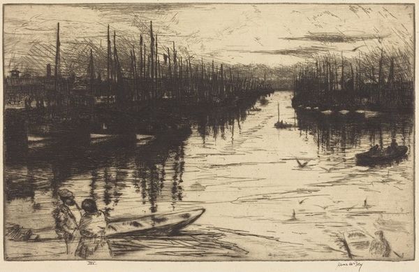 Editor: This is "Evening on the Garry," an etching created by David Young Cameron in 1906. It's so subtle and subdued, but also incredibly detailed. I am struck by the process. What does the materiality tell us about this piece? Curator: It's crucial to consider the etching process itself. Look at the lines - the varying depth suggests different biting times in the acid bath. The labor-intensive nature of etching in the 1900s made printmaking more accessible, opening it up beyond painting and sculpture which previously was a sign of wealth and privilege. Does this impact how you view it? Editor: That’s fascinating! So, the print medium itself challenged established hierarchies. How does the setting, the landscape itself, factor into this reading? Curator: Well, Cameron’s choice to depict the “Garry” speaks volumes. Was this an area undergoing industrial development, perhaps? The landscape genre becomes a site of negotiation – reflecting on progress but also potential loss as industries altered traditional views and practices. The etching method allows many prints and dissemination - where are they circulated and to what public? How does Cameron present the worker(s) near the center of this Garry to reflect that shift? Editor: The lone figure, almost dwarfed by the landscape, adds to that feeling. Knowing this could speak to the social transformations, the shift towards mass production makes me appreciate the artist's skill. I originally focused on its aesthetic quality, but the cultural context makes it even richer. Curator: Exactly. We often forget that art is work and production is cultural. Appreciating the relationship of labor, materials, and environment helps us question value—then and now. Editor: I’ll definitely be paying more attention to those relationships in future artworks. Thanks!
