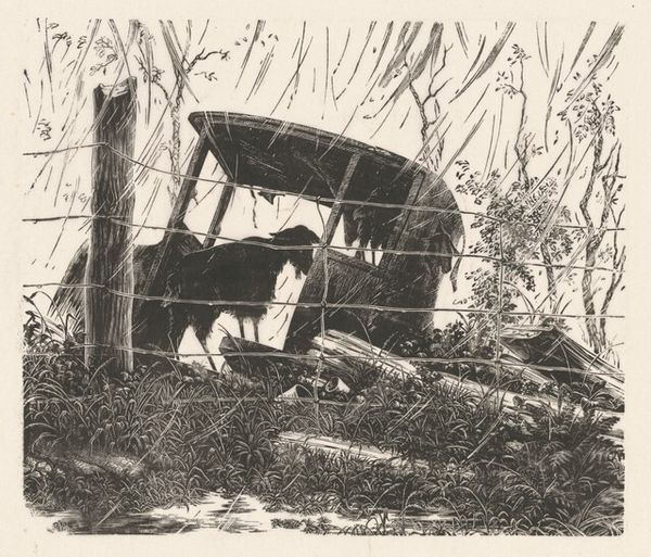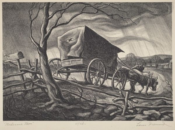 Hazel Fulton McGraw created this somber print, ‘Derelict,’ using etching and engraving techniques on paper. McGraw worked with an intaglio process, meaning that she incised lines into a metal plate. The plate would then be inked, and the surface wiped clean, leaving ink only in the recessed lines. The plate is then pressed onto paper, transferring the image. Here, the linear hatching and cross-hatching give the whole image a strong sense of texture. You can really feel the rough canvas of the truck cover, and the scrubby ground all around it. There is something tragic about McGraw’s subject here. This broken-down truck, apparently abandoned in a field, speaks to the harsh realities of rural life. The labor and industry it once represented are now still, overcome by nature. McGraw is reminding us that all things, even machines, must eventually return to the earth.