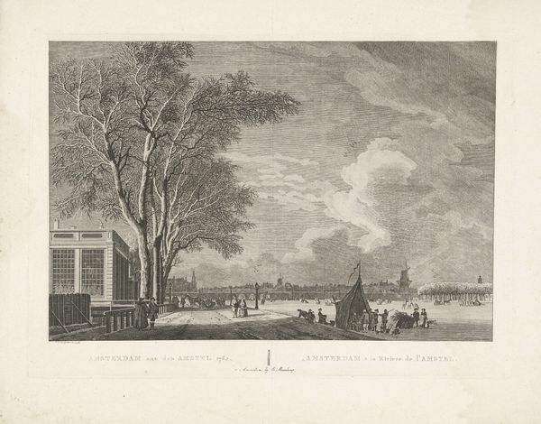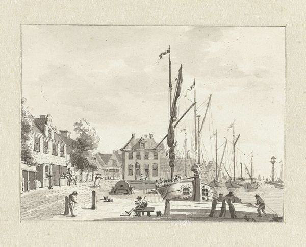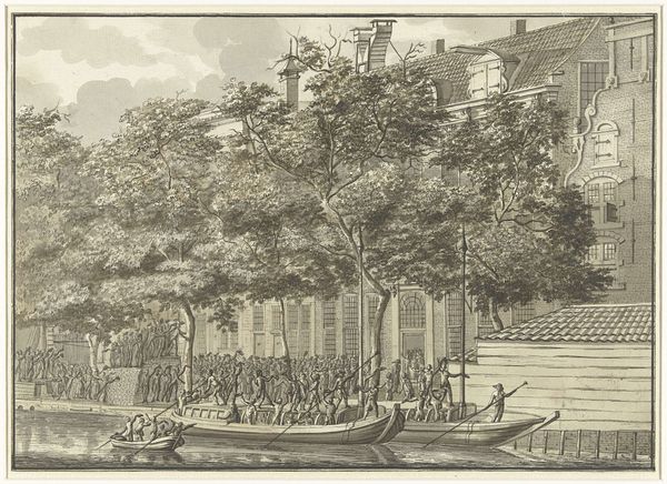 Curator: This etching, crafted by Caspar Jacobsz Philips in 1768, offers us a "View of the Naval Storehouse." It's currently held at the Rijksmuseum. Editor: It possesses a tranquil air. The gray hues imbue it with a classical feel; almost photographic in its detailed composure, were it not from a time before photography. Curator: Indeed. Philips utilized etching to meticulously recreate the urban landscape. Look at how he detailed the Zeemagazijn, an integral hub for naval supplies, and consider its implications within Dutch maritime power. Editor: Note, the receding perspective draws us into the heart of the cityscape. Philips guides our eyes across the planes—the trees closest, figures clustered beside coiled rope. Then we follow the boats on the water to the warehouse. The texture of the tree foliage provides a contrast to the building's strict architectural structure, wouldn't you agree? Curator: Precisely. It's this juxtaposition of the organic and the manufactured that I find interesting. One can examine the means of artistic production to reflect societal priorities— resources funneled towards naval dominance evident even in landscape etchings. Editor: The repetition of vertical lines is masterful: the building's pillars, the tree trunks, the masts. Philips understood how to craft unity out of disparate components; the uniformity lends balance to the etching as a whole. Curator: Also worth noting is the rise of landscape work and the consumption of these prints among a rising middle class, eager to showcase their acquired wealth and knowledge of their city's attributes. This informed artistic decisions and distribution. Editor: It's a testament to Philips’ compositional control, a complexly rendered illustration of the period. Even from a modern perspective, the artist evokes a moment in time so thoroughly. Curator: From that vantage point, our discussion provides a new way to contemplate the artwork as a signifier. Editor: True, that's given me something more to observe about this artwork, I appreciate the dialogue.