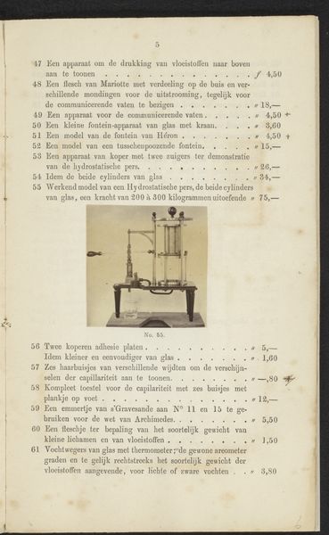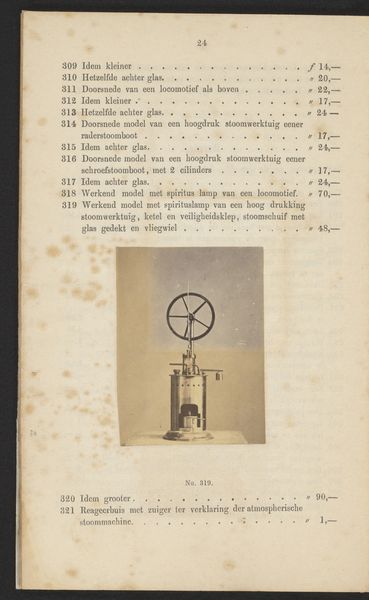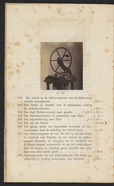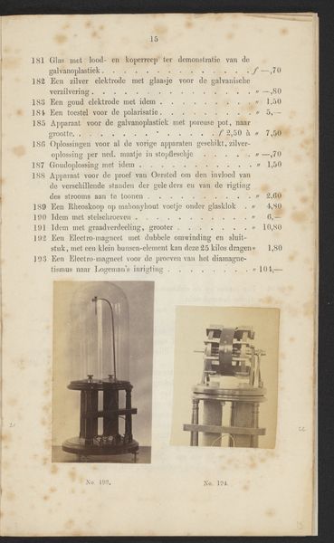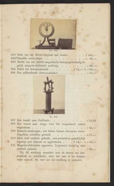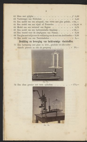 Editor: This is a photographic print titled "Elektriseermachine," dating back to before 1867, by F.W. Funckler. The image, set on what seems to be a page in a book, shows what appears to be some sort of static electricity generator. It seems almost like a whimsical piece of proto-scientific apparatus. What do you see in this piece, given your focus on history? Curator: This is a fascinating object! Seeing it catalogued in a printed work situates it firmly within the rise of both scientific pursuit and a sort of commercialization of scientific equipment during the 19th century. This image acts almost as an advertisement. Do you notice how it's not just documenting the object but also implicitly promising its capabilities to potential buyers or curious amateur scientists? The printed text surely lists dimensions and prices. Editor: Yes, I see that now! The layout of the photograph in a catalog highlights the intertwining of scientific exploration, manufacturing, and distribution of scientific instruments. It’s not just about scientific advancement, it's also about markets and public access to knowledge. Curator: Exactly. Furthermore, consider the implications of photography being used to reproduce these machines. The photograph democratizes the image of these exclusive machines. The act of printing itself becomes a vital method of distributing knowledge and expanding participation within scientific endeavors. So the question is who gets access, how and where. Editor: So it is about looking into these systems? I’ve always seen photography as a neutral recording medium, but now I am viewing it more as another layer that determines public knowledge about art. Curator: Precisely. Analyzing it like this can reveal power dynamics and access to knowledge, reshaping how we understand both science and its relationship to society at that time. Editor: It is like unpacking what knowledge was considered valuable at that time, where value is also financial, academic, cultural! This recontextualizes even what feels like just a 'record' for me. Thank you!
