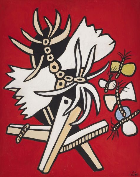 Fernand Léger made this painting, "Both Handlebars," with oil on canvas; its date is unknown. Looking at this piece, what strikes me is how Léger takes these industrial forms, hard-edged and geometric, and somehow makes them playful. The white lines, thick and looping, create a sense of movement, as if they’re perpetually in motion, twisting and turning against the yellow ground. The paint application itself is smooth and deliberate, with each color clearly defined by dark outlines. It's like he's building up the image, piece by piece, with layers of color and form. The small black form in the center reminds me of a kind of primal, almost totemic image. It’s roughly rendered, yet has a definite presence. It’s a good example of how he can invest these simple shapes with a surprising amount of feeling. I’m reminded a little of Stuart Davis, another artist who was interested in bringing the energy of the modern world into painting; both artists embracing a kind of visual exuberance.