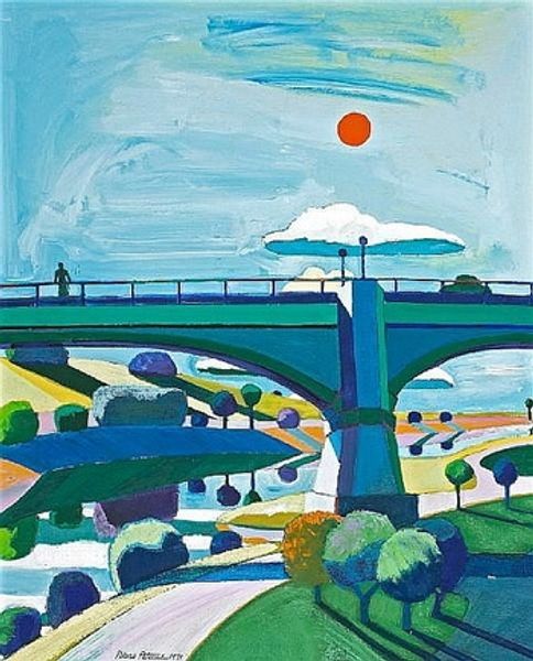 Editor: This is "Lagoon Picnic," an acrylic on canvas work from 1971 by Roland Petersen. The composition really strikes me with its flattened perspective and bold color choices – it feels very of its time, yet the landscape itself is so abstracted. How do you interpret this work? Curator: I see Petersen grappling with representation, using a vibrant, almost hyperreal palette to both depict and question the very notion of a 'leisurely picnic.' Consider the social context of the early 70s, steeped in counter-cultural movements and a questioning of established norms. Does this scene of leisure seem truly carefree, or is there a subtly subversive commentary embedded in its artifice? The sharp lines and geometric forms, combined with the somewhat detached figure on the right, evoke a sense of alienation. Editor: Alienation? I initially saw it as purely celebratory of a carefree life, like a sunny day idealized. Curator: I challenge that initial reading. Petersen may be engaging with the idealized imagery often used in advertising or popular culture, subverting it by hinting at an underlying tension. Think about the political landscape at that time; the Vietnam War protests, the fight for civil rights. Is it possible this seemingly idyllic scene serves as a contrast, highlighting a privileged detachment from these realities? Look at how the figures are devoid of personality and depth; what statement do you think Petersen makes through this choice? Editor: I guess it is not the lighthearted scene I first imagined. So much going on beneath the surface! Curator: Precisely. Petersen encourages us to question the easy consumption of images, prompting a deeper consideration of the social and political forces at play, even within a seemingly simple scene. Editor: Thank you, I see this work in an entirely new way. Curator: And I think questioning easy assumptions is a great thing!