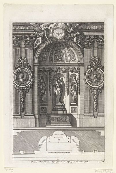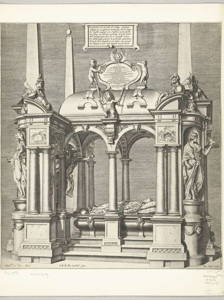 Curator: I find this print, titled “Huis van de Slaap” or “House of Sleep”, remarkably evocative. Bernard Picart created this engraving in 1733. Editor: Yes, immediately I'm struck by the baroque theatricality of it all. The way the light and shadow interplay makes it feel almost like a stage set. A rather dark and dreamlike stage, though. Curator: Indeed. Let's delve into that darkness. The engraving, with its architectural theme, shows the house of Hypnos. It really points to the symbolic role of architecture in early 18th-century thought. Spaces meant much more back then than a place. The elephant and ram, for example, speak to classical symbolic traditions surrounding sleep, while angels of divine visitation look out from the balustrade. Editor: Fascinating. So this isn't just about sleep; it’s about cultural understandings of what sleep means – spiritually, perhaps psychologically even. And that framework gives it the emotional complexity you mentioned, because sleep in so many communities symbolizes not only healing and rest, but danger or unconscious surrender to social controls. What a deeply layered proposition. Curator: And within that framing of space, we see people. We're witnessing a negotiation with something powerful, outside the self, and this gives rise to a dialogue regarding selfhood and society. The history of reception around sleep rituals show how this is constructed within particular societal rules or at their margins. Editor: Absolutely, the visual elements create an atmosphere rife with social significance and historical meaning that continues to spark a lot of critical theory that engages questions surrounding social norms and deviance. I like how those themes resonate with today's debates. Curator: Me too. It's a privilege to revisit the critical concerns embedded in art. It also confirms that artistic creations aren’t just reflections, but potent sources of cultural awareness and instruments for the advancement of social ideas.