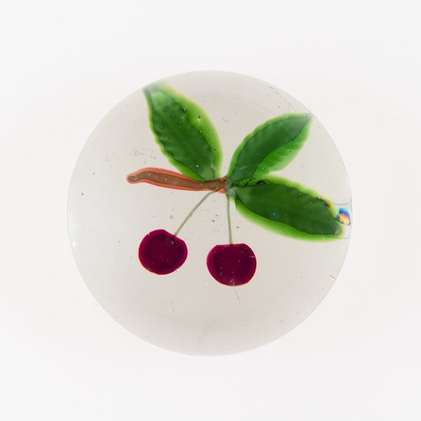 Curator: This delightful, albeit small piece is titled "Paperweight" made around the 19th century, attributed to the Compagnie de Saint Louis. Its core composition involves both glass and paper elements. Editor: Immediately, it strikes me as a fascinating exercise in encapsulating—literally freezing a fleeting moment of organic life. The cherry motif encased feels simultaneously vibrant and strangely preserved. Curator: The aesthetic is driven by its masterful exploitation of glasswork. Look at the intentional distortion, how the convex form amplifies the details, especially those tiny air bubbles—their distribution lends an almost ethereal quality. Editor: Precisely, the production tells its own story; someone carefully layering molten glass to not only magnify the interior artwork but to protect it. One imagines this functional piece, born out of dedicated studio glassblowing, intended to be an emblem of status. Curator: Observe how the artist plays with dimensionality within a confined space. The chromatic range isn’t broad—predominantly greens and reds—but these choices bring life to the piece. The deliberate, graphic styling suggests influences of symbolism in its selection of familiar imagery. Editor: Right, glass, being a fairly challenging medium, presents significant hurdles to create such controlled results with nuanced coloration and clarity. Each cherry has incredible detail with the illusion of being translucent—you wonder what techniques they developed to manipulate molten materials with such control. Curator: It brings to light questions about the object itself and function. How much weight did visual balance and symmetry carry to those crafting paperweights during this period, and to what degree were they prioritizing aesthetic principles, such as those of the decorative-art movements? Editor: Absolutely. Perhaps the paperweight becomes a signifier—its fragility and materiality a representation of labour or the consumerist ideals gaining momentum during its making. It challenges our contemporary understanding of decorative art as pure form devoid of sociopolitical meaning. Curator: An enriching discussion, underscoring the complex relationship between functionality and formalism present in these objects. Editor: Yes, uncovering both tangible processes alongside the layered social echoes found in the piece have broadened my insight.
