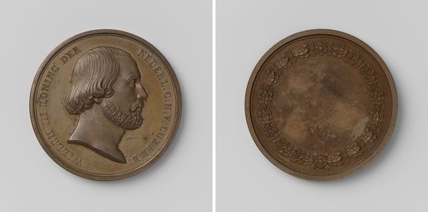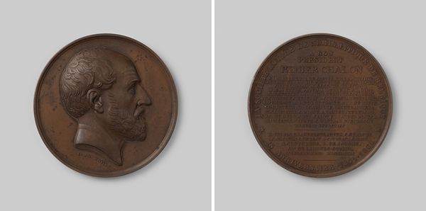 Curator: This is a bronze medal created in 1842 by Johannes Petrus Schouberg, titled "Jonkheer Johan Willem van Vredenburch, dertig jaar grootsecretaris der Grote Loge van Holland.” Editor: It looks like a commemorative coin, almost. There’s a profile portrait on one side, and writing on the other. What do you see in this piece? Curator: The choice of bronze is telling. Bronze, being a readily available and relatively inexpensive material at the time, speaks volumes about the social function of this piece. Medals like these were often cast in multiples, accessible not just to the elite but a broader circle connected to Vredenburch and the Freemasons. Consider also the labor involved – the casting, the engraving. It represents a whole network of skilled artisans. Editor: So it’s less about the subject of the portrait and more about what it represents in terms of social standing and production? Curator: Exactly. While it memorializes Vredenburch, it simultaneously illustrates the power and reach of the Freemasons through a material object circulated amongst their members. Notice how the inscription almost becomes part of the production, a branding if you will, solidifying the Lodge’s identity and perpetuating its narrative. Editor: That's fascinating. I never thought about medals in terms of their social function and means of production. Curator: Think about it – who commissioned this medal? Who profited from its creation? These are critical questions that uncover the underlying material relations. Editor: This changes how I view historical portraiture entirely. It's less about the individual and more about the system that produced it. Thanks! Curator: My pleasure! Now you know to look beneath the surface of the subject matter. Material speaks volumes!