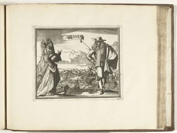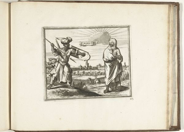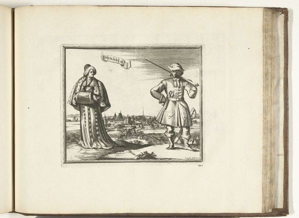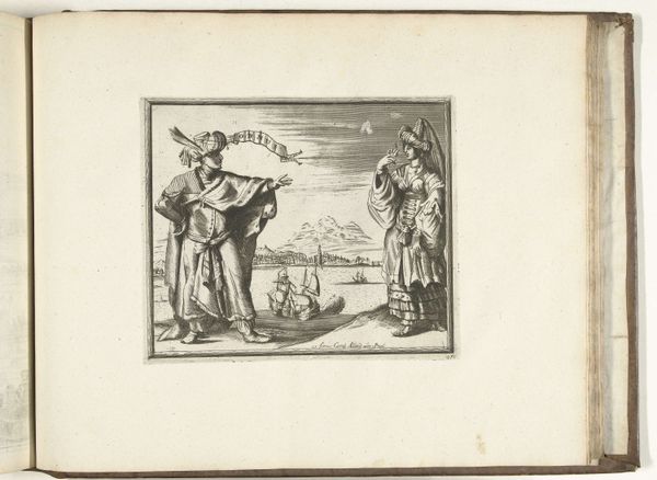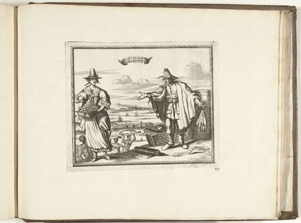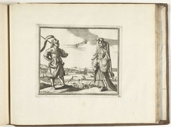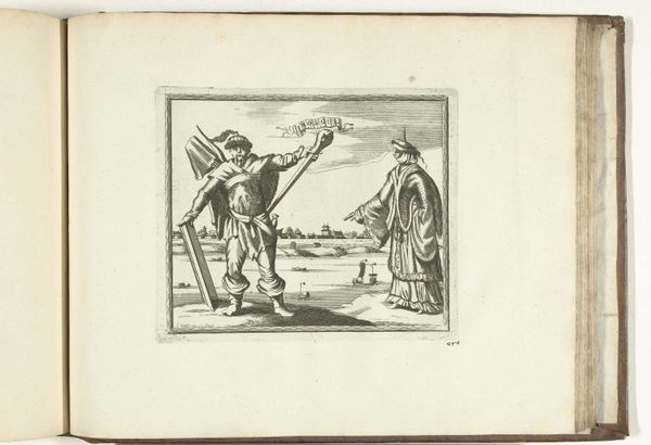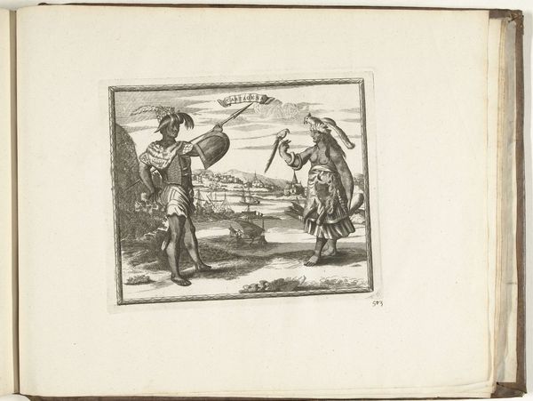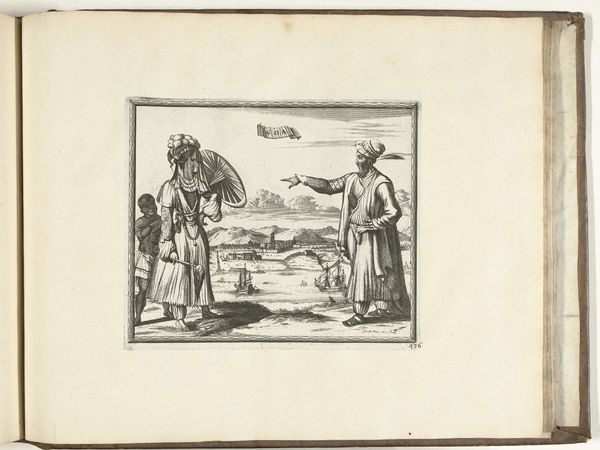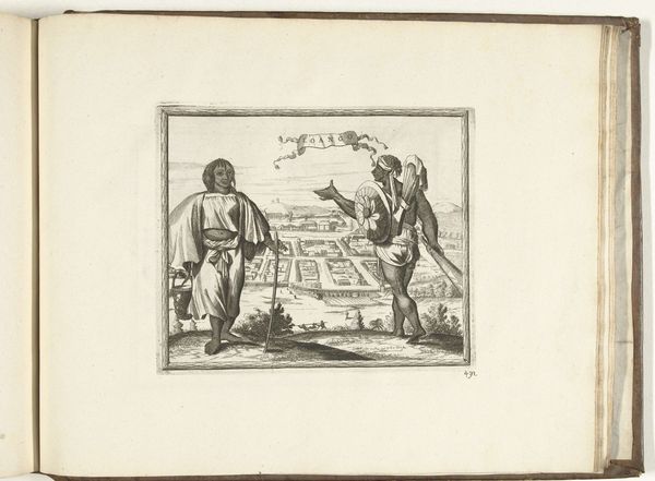 This print, titled "Inwoners van Benin," was made in 1726 using engraving, a process involving carving lines into a metal plate to hold ink. The linear quality of the engraving defines the forms, from the clothing of the figures to the distant city. Look closely, and you’ll see that the artist, Carel Allard, used hatching and cross-hatching to create tonal variation, suggesting volume and texture. The print's aesthetic is inextricably linked to this labor-intensive process. Beyond technique, consider the social context. Prints like these were often produced to disseminate information, or perhaps misinformation. They are tied to the histories of colonialism and trade, attempting to capture and circulate knowledge about distant lands and their inhabitants. The very act of representing these “inwoners” or inhabitants through a European lens raises questions about power, representation, and the gaze. Prints like this one remind us that art is not just about aesthetics but also about the social and political forces that shape our understanding of the world.
