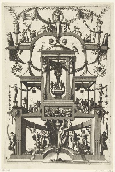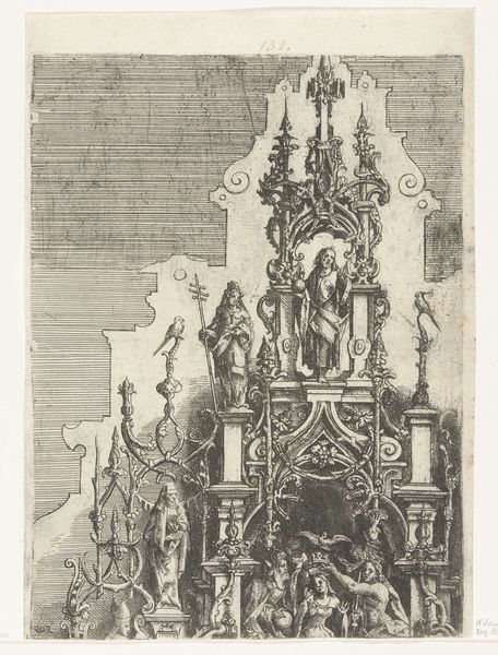 Curator: Wow, what a fascinatingly elaborate structure. It’s making me think about how we mark loss, you know? The textures are giving me chills. Editor: This intricate piece is Cornelis Galle I's "Catafalque for Isabella Clara," an engraving dating back to 1634. It’s currently held at the Metropolitan Museum of Art. Galle really captured the grandeur and sorrow of the occasion. Curator: A catafalque! So, a temporary structure to honor the dead, but temporary architecture nonetheless...The whole thing has such a towering, skeletal feel. Almost fragile despite its ornamentation. It really feels very poignant, like an ache turned into a building. All of those candles! I'd almost describe the composition as explosively vertical. I find myself thinking about pyramids, mausoleums, the impulse to build up and outwards when confronted with death, or rather a great death. Editor: It's fascinating to consider the symbolism layered within. The flags and ornaments bear emblems of power and status. Isabella Clara Eugenia was, after all, a sovereign ruler of the Spanish Netherlands. But there is also an unmistakable religious element interwoven. Notice the architecture of the baldachin under which she lies; the bones. Curator: Definitely, there's something deeply ritualistic at play. The Catholic associations are undeniable, almost oppressive. I can feel that sorrow, it's a thick, perfumed air, all ceremony and symbolism, not all that honest if you think about it, with an emphasis on the theater of power. Like all grief on display! A public demonstration in the cathedral that even translates to us today. Editor: Indeed. And look at the scale of it – the tiny figure of the monk in the corner emphasizes the overwhelming size of the catafalque, a testament to Isabella's importance. All the elements—architecture, emblems, the body laid out on view—merge into a potent reminder of mortality. Even now, looking at it, the gravity holds fast. Curator: Absolutely. It's a memento mori for the ages. Looking at this, I wonder how future generations will interpret our own rituals and monuments? It's always in flux, and always worth a bit of reflection. Editor: A worthy pondering, indeed. It’s easy to get lost in the artistry and the symbolism, isn't it?