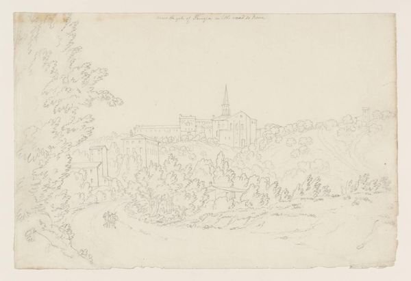 Curator: This is Jan Striening’s “View of Osnabrück from the Musenburg,” likely created between 1864 and 1868. It’s a cityscape rendered in pencil. Editor: My first impression is a sense of stillness, despite all the rooftops. It feels very light, almost ethereal. Look how finely he's controlled the pencil to get this delicate view. Curator: Striening’s landscapes often documented burgeoning urban environments. They served not just as artistic representations, but also as a record of civic and economic transformation in the region. How spaces were understood, managed, and marketed played a role in this shift. Editor: Right, the drawing medium itself plays into that! The quick, precise lines, suggest efficiency and recording. It shows how industrial development became visible through an increased volume of readily accessible paper. Striening used a simple pencil, but the drawing still shows an industrializing landscape with all its materiality: smoke, construction, timber. Curator: Interesting point. One also can’t ignore the social aspect of viewing a cityscape from a distance, from the Musenburg as it suggests in the title, to get that wider, broader image. It offers a controlled gaze, fitting within the emerging norms of the time as new modes of seeing and regulating social behavior emerged. Editor: It makes you wonder about the labour. Pencils like these would have been readily made for these types of sketches, so in addition to Striening as an individual artist, there's a factory of labourers whose production feeds directly into Striening's practice and the visual vocabulary of this landscape. Curator: Absolutely. And the relatively modest scale speaks volumes about its accessibility. A drawing like this could be easily reproduced or collected. So, considering Striening, pencils, paper, Osnabrück and all their stories... this innocuous scene hints at far bigger operations that shift both how people live and make. Editor: Yes. Thinking about material and method really changes how we look at this ostensibly traditional landscape. It speaks volumes!