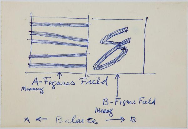 Curator: This intriguing sketch, "Art Theory Text with Diagrams," reveals Stuart Davis wrestling with the fundamentals of art. It's essentially a visual note jotted down, rendered in pen. What strikes me first is the kind of almost childlike simplicity. Editor: Yet there's a radical reduction at play here. Davis is stripping down concepts of form and color, questioning the very basis of visual perception. The grid reminds me of Sol LeWitt, and the emphasis on text certainly foreshadows conceptual art movements that interrogated art's linguistic turn. Curator: Exactly. The handwritten notes become as vital as the shapes themselves, almost like a stream-of-consciousness peek into his creative mind. I can see him musing over how our minds construct a visual experience. Editor: Absolutely. And it's difficult to separate the text from the diagrams. This makes me think about the interplay between language and image, and how they shape our understanding of space and representation. Curator: I agree, it’s like the diagrams give shape to the ideas, and vice versa. Each informs the other. I love how it feels so alive, a frozen moment of thought in the making. Editor: For me, it’s a reminder that even what seems most fundamental is also deeply constructed, shaped by language, context, and power. But what a beautiful, concise manifesto.
