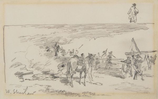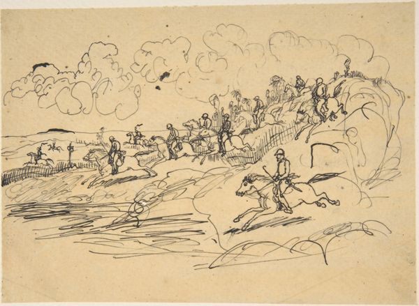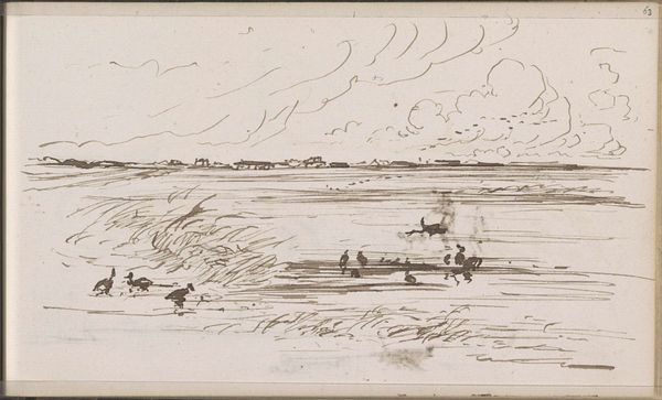 Curator: The first impression I get from Johannes Tavenraat’s ink drawing "Landscape with Figures Pulling a Rowing Boat to Shore" is one of stark, windswept labor. It's dated 1865 and currently held in the collection of the Rijksmuseum. Editor: I see figures engaged in labor but also notice the tension between representation and the artistic process itself. What does the act of drawing, the choices of ink and paper, tell us about the artist’s understanding, or even romanticizing, of labor? Curator: Tavenraat seems to focus more on accurately capturing the physical strain involved, down to the posture of each figure. Look at the way the figures are interacting with the landscape, their hands grasping ropes attached to the boat; you can almost feel the weight and drag. It suggests a direct engagement with the materiality of work. Editor: Precisely. Realism emerged alongside the rise of industrial capitalism, offering representations of the working class and their relationship to production. But what about those with power depicted? What about class relationships and how they shaped access to resources and determined these people's labor? Curator: Well, think about what this scene omits. The actual process of fishing, for example, is missing; what is being made available here is work as tangible labor rather than its economic endpoint, drawing focus to its physicality rather than any commodity produced. The medium itself lends to this, as an ink drawing is an easily reproducible method, like these workers themselves who are doing work. Editor: Yes, but it’s important to acknowledge the art market in this. An artwork portraying the working class, like this, gets sold and possessed by wealthy patrons. Are these figures being displayed without critique? This makes it a social statement regarding inequality. Curator: But this level of detail feels inherently respectful of the labor performed, and it avoids aestheticizing it into something falsely idyllic. He seems concerned with the here and now of the task at hand, trying to faithfully represent its textures. It makes me wonder, what inks were available at the time, what supports might he use, who sold them, who were his art making peers and contemporaries? Editor: A powerful and important consideration to ensure these scenes continue to receive their due attention and remain subject to robust analyses about artistic intent and contemporary social forces.