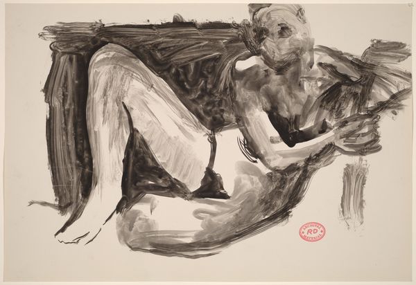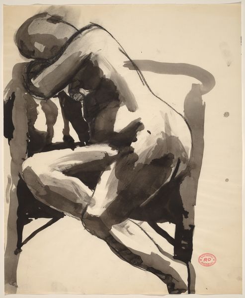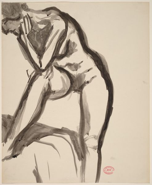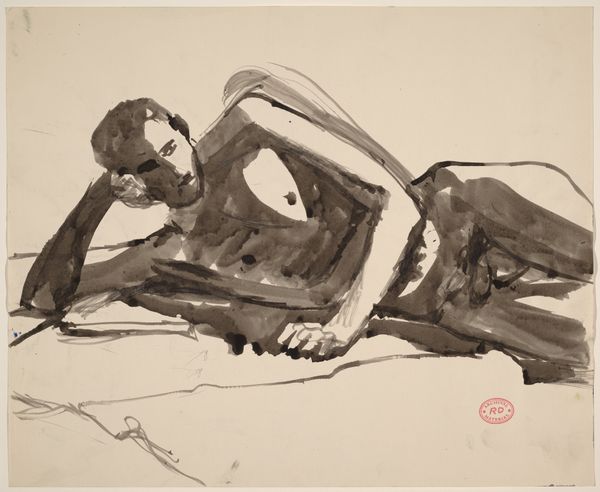 Richard Diebenkorn created this untitled ink wash drawing of a reclining male nude. While undated, this work comes from a period when Diebenkorn was developing a more figurative style after his time serving in the military during World War II. Consider the historical context: After the war, artists grappled with representing the human form and experience. Diebenkorn, like many artists, turned to the figure as a way to explore themes of vulnerability, identity, and the body’s relationship to space. The male nude, traditionally a symbol of classical ideals, is rendered here with a raw, almost vulnerable quality. The loose, gestural brushstrokes create a sense of immediacy, but also of emotional distance. The figure is presented without idealization, inviting viewers to contemplate the complexities of masculinity and representation. The composition rejects conventional heroic depictions in favor of a more intimate and introspective portrayal of the male form.