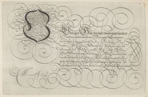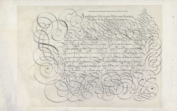 Jan van de Velde I created this calligraphic design, "Ontwerp van een schrijfvoorbeeld: Al muy honrado" in the Netherlands, sometime before his death in 1623, using pen and ink. This writing sample, now preserved in the Rijksmuseum, speaks volumes about the values and skills esteemed in Dutch society at the time. Calligraphy wasn't just about neat handwriting, it was an art form, a display of education, refinement, and professional competence. The flourishes, the controlled variation in line thickness, all signaled the writer’s mastery. The text itself, though partially obscured by the elaborate script, hints at dialogues and perhaps moral lessons. To fully understand this piece, we would want to delve into the manuals and educational practices of the time. Who was being taught to write like this, and for what purposes? Was this a skill primarily for merchants, or also for aspiring members of the government? By looking beyond the visual elegance and examining the social and institutional context, we can begin to understand the values embedded in this seemingly simple writing sample.