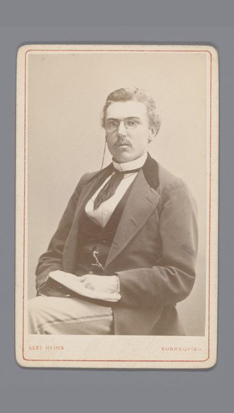 Curator: Welcome to this striking gelatin silver print from between 1860 and 1900. The portrait by H. Fiedler titled "Portret van een man met snor, sik en stropdas," offers a glimpse into a world of shifting societal structures. Editor: My immediate reaction is to the subject's somber mien, which is framed so precisely within this ornamental border, amplifying the intensity and gravitas already implicit in this dark tonal palette. Curator: Absolutely. I find myself considering what a photograph meant during this period – its place in shaping social status and personal identity, especially for bourgeois men staking their claim in public life. The deliberate cultivation of the beard and mustache speaks volumes, adhering to standards of masculinity while suggesting social identity in a burgeoning public sphere. Editor: You know, from my perspective, this formal portrait provides insight into how light can be used in order to reveal the character that inhabits this man, look at the light’s gentle graduation of tones from the planes of his forehead, his cheeks. Curator: But there’s also an inherent performance embedded in the photograph’s style, wouldn't you agree? Posing like this could be seen as constructing masculinity through careful detail. We must not separate it from that period of expanding photographic availability across diverse communities that might have seen it differently than we do now. Editor: Yes, context certainly shapes the meaning, but technique cannot be overlooked! Think about how the sharp focus on the face draws our eyes, underscoring a central focus that helps solidify and augment the geometric qualities in the composition! Curator: When viewing artworks such as this, it's about engaging with not only what's visible, such as fashion statements, but reflecting on broader cultural and historical significance attached both at that moment and afterward as ways of understanding historical contexts for ourselves, as well. Editor: A brilliant summary—one that leaves me contemplating the very nature of photographic portraiture—not merely capturing likeness, but rather, shaping how an identity performs and communicates its own symbolic presence.