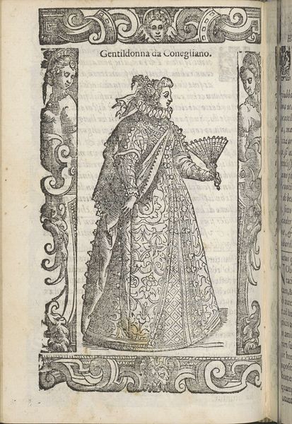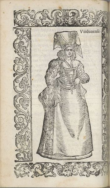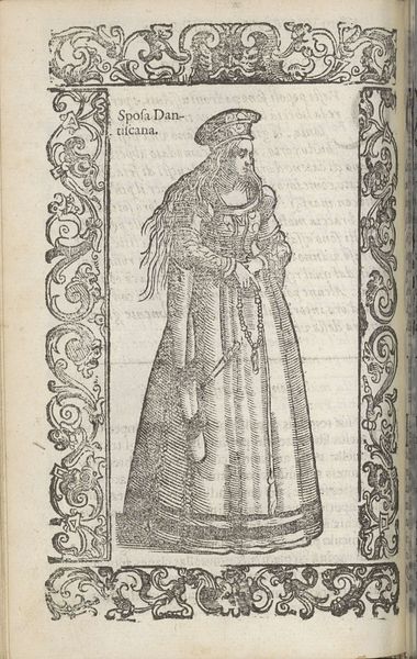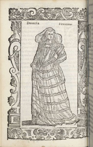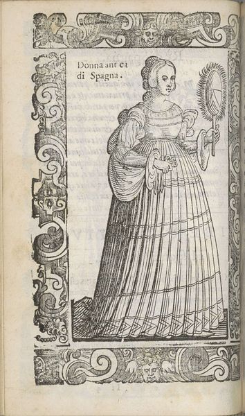 Curator: This intriguing print, “Donzella di Turino,” or “The Young Woman of Turin,” was created in 1598 by Christoph Krieger, during the Italian Renaissance. It’s an engraving. Editor: She looks remarkably self-possessed. Despite the somewhat rudimentary linework, the artist has captured a sense of serene dignity. The slight smirk gives a touch of irreverence. Curator: What's striking is how Krieger has captured this "Donzella" within the broader visual culture of the era. Think about the way images, particularly prints, functioned then. They were disseminating ideas, social ideals, and even fashion trends across geographical boundaries. The very existence of this print implies she held a position, whether through family status or something inherent about her personhood, that Krieger felt should be put on view. Editor: Right, her very presentation is a carefully constructed statement, a controlled projection of identity. It speaks to me of both privilege and the constraints placed upon women, even those with considerable social standing. What narratives are opened or closed by her fashionable presentation? Curator: Precisely. Let's examine her garb. It is, without doubt, very stylish. Yet, that stylishness, as you said, signals constraints, even while implying sophistication. The multiple layers, the cinched waist, all tell a story about expected behaviors and displays of wealth. I can't help thinking about how those choices limited bodily autonomy and agency. It highlights a fundamental contradiction: visible power gained only through subservience to the very patriarchal structures she subtly defies through a confident pose and a little flower. Editor: And notice the borders and how they contain her? She seems penned, catalogued...almost commodified as an object of desire or perhaps admiration, a collectible exemplar of idealized femininity available for consumption and display. Curator: An apt summation, really. This image makes us acutely aware of the social theater women had to navigate in the Italian Renaissance, a theater where clothing, demeanor, and representation could solidify or subvert their position within society. Editor: Absolutely. She provides a fascinating glimpse into the complexities of early modern identity and representation, offering space for nuanced reflection on agency, constraints, and the politics of image-making.