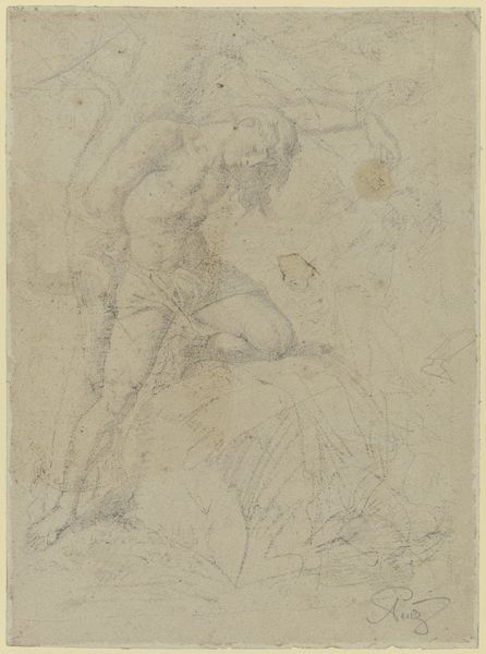Curator: I’m struck by the raw energy emanating from this chalk drawing. What is your initial response? Editor: There's a quiet drama here, a sort of suspended anticipation. The red chalk lends it a warmth, but also an immediacy, almost as if the vision is unfolding before our eyes in real-time. Curator: Exactly. This piece, circa 1660, is Pier Francesco Mola's "Vision of Saint Bruno", currently residing at the Städel Museum. Mola captures the moment of Bruno’s enlightenment. The relatively loose sketching is interesting; history painting typically seeks high degrees of polish. Editor: Absolutely. And that roughness enhances the mystical qualities, doesn’t it? Notice the landscape—or lack thereof. There's a hint of nature around St. Bruno himself, then wisps dissipating upward, and almost nothing else, creating a stage for this profoundly personal moment. It suggests a transition, a shedding of the earthly for something divine. Curator: Precisely. Mola utilizes figuration here in conjunction with what barely constitutes landscape to create this emotional weight and amplify Bruno's solitary connection to the divine. Red chalk itself, a relatively immediate medium, also bolsters the sense of intimacy. He's not merely depicting the scene but rather providing us access to Bruno's spiritual state. Editor: And that head thrown back, the hand raised—the classic posture of revelation, of submission to something greater. The skull adds a fascinating element, the 'memento mori' constantly reminding him of the transitory nature of human existence, reinforcing Bruno's radical choice to embrace isolation and spirituality. Is this drawing of significance for his wider output, his overall development as an artist? Curator: While Mola is mostly known for his paintings, especially frescoes, it showcases his exceptional skill as a draughtsman. I think this artwork also anticipates trends. His work demonstrates the emotional turbulence and heightened spirituality that Baroque artists aimed to convey. In that regard, the work fits right into the moment. Editor: So we are invited not just to observe Saint Bruno’s vision, but perhaps also to consider our own search for meaning. Curator: Indeed. A work like this reveals much about artistic and social transitions during the period.