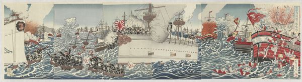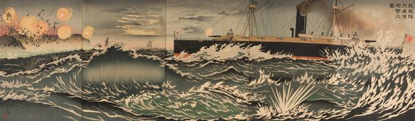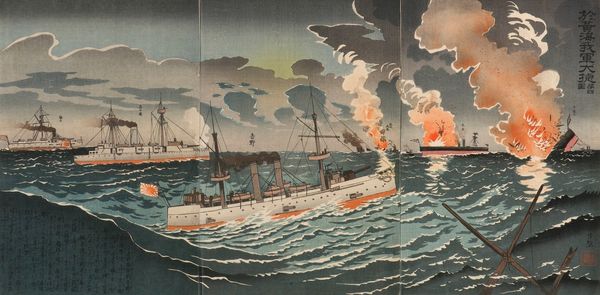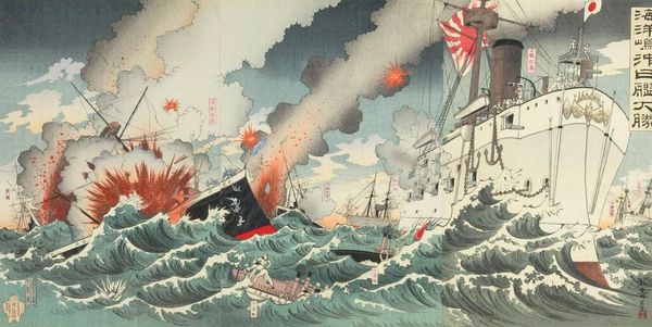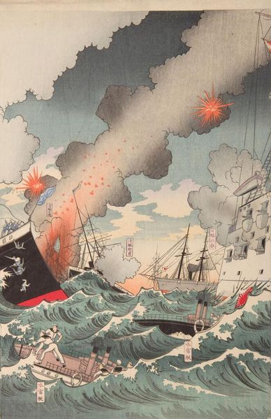 Editor: This dynamic woodblock print, "The Saikyō-maru in the Hard Fighting off Haiyang Island," by Kobayashi Kiyochika, created in 1894, really captures the chaos of naval warfare. The bursts of white and grey smoke and water against the darker ships…it’s dramatic. How do you interpret this work? Curator: I see a powerful convergence of traditional aesthetics with modern warfare imagery. Notice how Kiyochika employs ukiyo-e techniques to depict a very modern battle scene from the First Sino-Japanese War. But, beyond just documentation, it evokes a collective memory. What do the water splashes symbolize to you? Editor: Well, on one level they simply represent the impact of cannon fire, but perhaps they also symbolize the disruptive force of modernization on traditional Japanese society at the time? Curator: Precisely! And the ship names themselves carry meaning. Saikyō-maru translates roughly to "the strongest," an unsubtle statement. The imagery is carefully designed to stoke nationalist sentiment and promote an image of invincibility. Even the placement of ships in the composition – one clearly in distress, engulfed in smoke – feeds into the narrative of Japanese naval dominance. Can you see how those visual symbols would be easy to absorb? Editor: That makes a lot of sense. The symbols reinforce a particular viewpoint on this naval battle and of Japan. The cultural context provides a crucial layer of understanding. Curator: Indeed, images like this became a crucial part of shaping public opinion and justifying the war effort. And consider Kiyochika himself; he was once a retainer for the Tokugawa shogunate! By creating this art he also redefines himself. Editor: It’s incredible how much depth is hidden within what appears to be a straightforward depiction of a battle. It has been very illuminating to understand Kiyochika’s work beyond the surface representation. Curator: Yes, images are powerful vessels of cultural memory and propaganda! It's been a great insight to explore the layers of symbols and history.