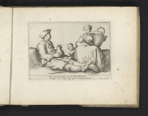Editor: We are looking at "Herderin met spinrok en twee herders," made sometime between 1632 and 1675, currently residing in the Rijksmuseum. The artist is Jean Couvay, and the medium appears to be ink on paper—it has the delicate linework of an engraving. I’m immediately struck by the composition, it looks so carefully constructed. What compositional elements stand out to you? Curator: The artist clearly prioritizes linear precision and tonal contrast to establish a visually stable structure. Observe the deployment of light and shadow to define the figures; ask yourself, what purpose might the sharp distinction of foreground and background serve in orienting the viewer? Consider how these components integrate into the composition's overarching schema. Editor: The way the light falls definitely creates a sense of depth, making the figures pop out. Do you think the engraving technique contributes to the mood of the artwork? Curator: Indeed. Note the consistent texture achieved through the engraved lines. They are neither purely decorative nor exclusively representational; they shape the essence of the pastoral theme through their uniformity and controlled variation. Can you see any structural parallel in the foreground that the artist established in the sky background? Editor: I notice that you talk more about the lines, tone and contrast instead of what the artists is trying to communicate, it make sense. Looking closely, it seems the artist made similar marks both on the lower and upper areas. I am learning how the pure composition affect how we understand and appreciate artwork regardless of the history or its message. Curator: Precisely! Such meticulous composition serves to distance the piece from any potential sentimental interpretations, focusing us on the calculated arrangement of form and light as its primary subject.