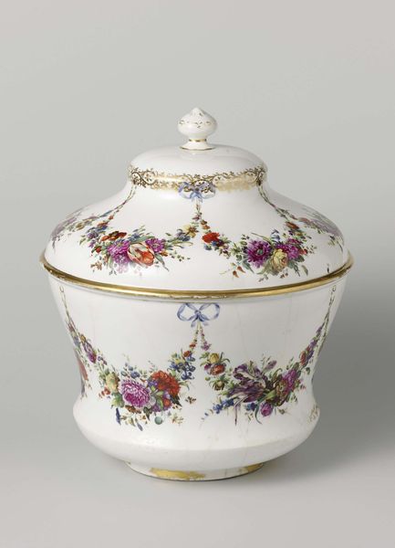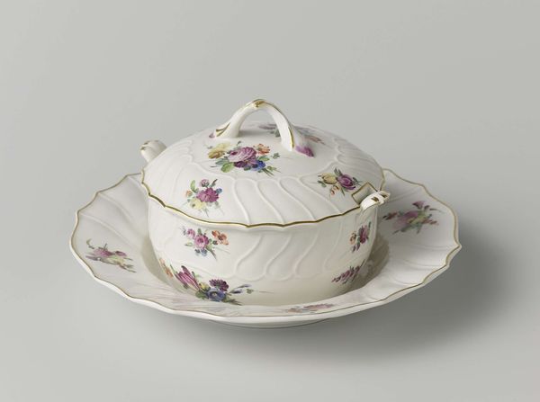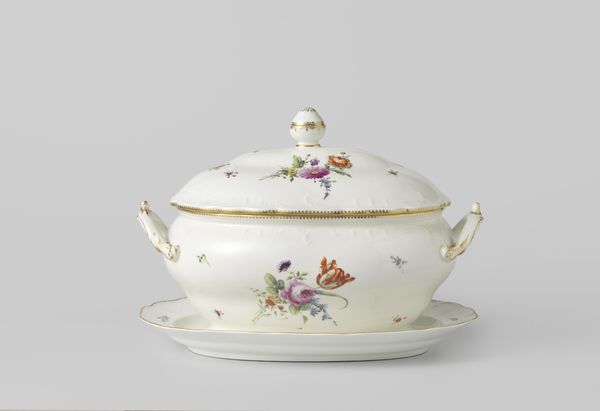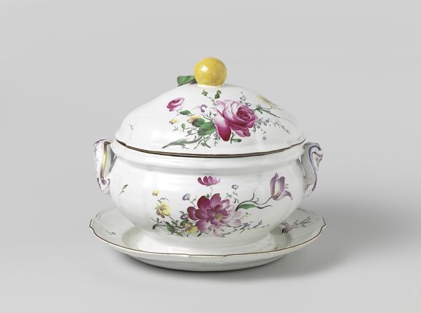 Curator: Welcome. Here we have a piece titled "Schaal met deksel," or "Bowl with Lid" made of porcelain around 1774-1784 at the Loosdrecht porcelain factory. Editor: Oh, it’s lovely! My immediate impression is how delicate yet substantial it seems. The curves are soft, and the painted flowers offer an element of luxury and beauty to the simple shape. It makes me think of tea parties and opulent meals enjoyed in the company of powerful elites during the Dutch Republic. Curator: Indeed. Its form exhibits strong Rococo sensibilities, doesn't it? Consider the asymmetrical floral designs, and those delightful feet—note the almost organic feel of the handle, like a burgeoning outgrowth from the main body. These are decorative gestures typical of the period, aren’t they? The painted blooms further highlight its sophisticated ornamentation, enhancing the complexity of its visual rhythm through colour play and detail. Editor: Exactly. And for whom was this crafted? It is not solely ornamental. This porcelain reflects cultural dialogues surrounding taste, class, gender and wealth—perhaps as a signal to display ownership and refined sensibilities, particularly for women, who were tasked with household activities, entertaining and supervising social interactions. What sort of conversations took place over this bowl? What anxieties or expectations was the user carrying during a particularly restrictive time for gender and race across the empire? Curator: That’s a fascinating point. From a strictly design standpoint, though, the bowl demonstrates incredible craftsmanship. Porcelain production during this time demanded specialized skill. The very purity of the white glaze establishes a foundation on which this artistic expression blossoms. Notice how the application of pigment enhances a contrast in visual tension, almost like the flower forms float against its pristine plane. Editor: Precisely! This bowl isn’t merely about artistic talent, it mirrors the prevailing attitudes of power. It demands we understand this history. When contemplating this vessel we must not exclude that. Curator: Well said. Reflecting upon both technique and the deeper cultural narratives undoubtedly enriches one’s viewing experience. Editor: Yes, it is important to critically interrogate all elements to foster dialogue and deeper connection with cultural shifts in our shared global society.