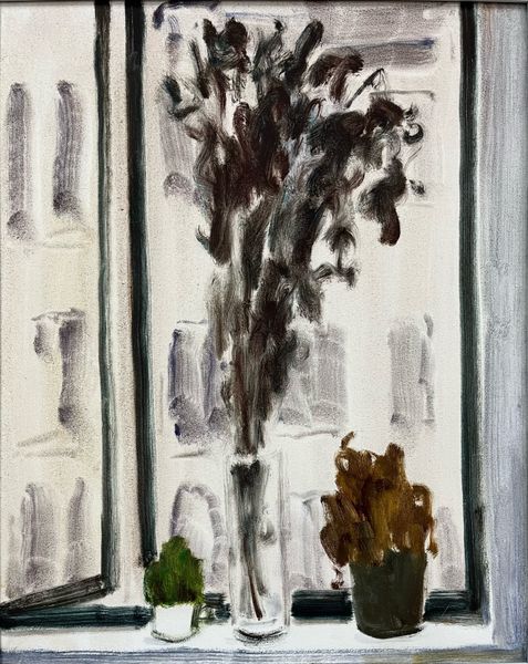 Editor: So, this oil painting is called *Winter Flower 1* by an artist named 鲁邦林. The monochromatic palette gives it such a melancholic mood, and the impasto technique makes me feel the rawness and fragility of the dying blooms. What stands out to you when you look at this piece? Curator: The title draws my eye initially. "Winter Flower" is already fraught with complex symbolism – resilience, hope amidst desolation, the memory of warmth in the face of cold. And these aren’t vibrant, blooming flowers; they're skeletal, nearly drained of color. Editor: I agree; the monochrome palette intensifies the stark, wintery mood, like a photo taken during a snowstorm. The floral arrangement appears fragile as the petals drop to the surface below. Curator: The flowers reach upward but lack the visual weight to stand tall, creating an unnerving tension. The dark vase itself – does that ornate design suggest celebration or confinement? Think of the Victorian language of flowers. The types of flowers and their arrangement were meant to carry specific messages. Editor: So, you see a darker significance to the images – as symbols loaded with cultural weight. Could it perhaps symbolize fading memories or unfulfilled dreams represented by the dying flowers? Curator: Precisely. This artwork touches upon universal human experiences – the transient nature of beauty, the inevitable decline, but also the stubborn will to endure. I’d love to know if the artist purposefully selected these specific blooms, or chose this arrangement, as each decision subtly shifts the image's story. Editor: I’m learning how to interpret artworks through their loaded symbolism – thanks for pointing that out to me. The monochromatic palette makes me want to interpret so many different concepts of transition and transformation. Curator: The key is that there are so many possibilities to discuss in these painted arrangements! That's where the power and complexity rests.