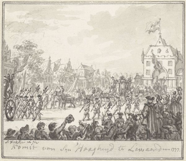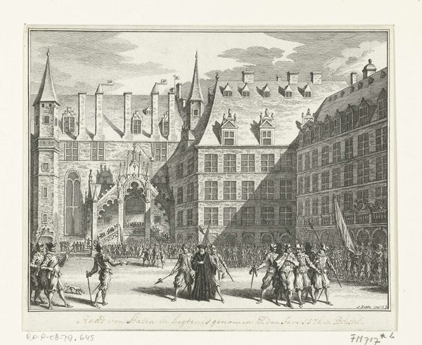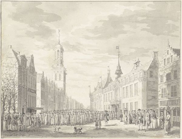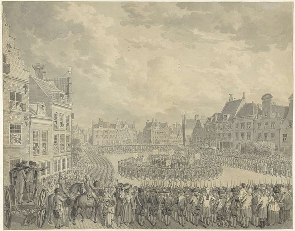 Curator: This is Reinier Vinkeles' 1769 engraving, depicting the arrival of Prince Willem V and Frederica Sophia Wilhelmina of Prussia at Amsterdam's City Hall on the Dam Square. Editor: It feels surprisingly modern for an 18th-century print. The artist's use of line creates such a vast, airy space. What strikes me is the feeling of contained excitement, of a public performance carefully managed and observed. Curator: Absolutely. Vinkeles captured a moment of high political theater. Willem V's power was increasingly challenged at this time, and these displays of public affection were crucial in maintaining the image of a strong Stadtholder. The engraving itself plays a role in solidifying that power by depicting popular support. Editor: It is very staged isn’t it? Look at how the crowd is pushed to the side almost out of the frame on both edges and packed on top of the buildings; the symmetry, the controlled space for the procession, the lined-up honor guard. Curator: It speaks volumes about the controlled environment. Vinkeles, working within the artistic conventions of neoclassicism, was meticulous in representing not only the event, but the social order it signified. It is very calculated imagery when it comes to conveying status, isn’t it? Even the architectural backdrop contributes. Editor: And look at that impressive city hall—now the Royal Palace. I would say it's about celebrating the enduring structures of power, not just in the ruling family, but within the city itself. A pre-revolutionary stability depicted at the surface that, with some consideration, also hides what is percolating underneath. Curator: Precisely! The architecture here takes on an active role as a character in a larger political story. The city itself almost approves the Prince’s rule. This image served as propaganda, whether intentionally or not, emphasizing stability during a volatile time. Editor: Seeing the cityscape as a key player makes it more interesting to view with a contemporary lens. It serves as a potent reminder that even seemingly straightforward historical images can carry multiple layers of meaning and that even architectural features in imagery carry strong messages and contexts. Curator: Yes, it really highlights how art shapes and reflects power dynamics in 18th century Amsterdam.