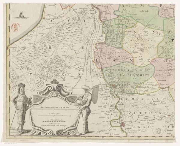 Editor: This is "Kaart van het hertogdom Limburg," a print, an engraving really, made sometime between 1639 and 1711 by an anonymous artist. It's incredibly detailed; you can almost feel the weight of history pressing down. How do you interpret this work? Curator: I see the print as a testament to the means and method of production and dissemination of geographic and political knowledge in the early modern era. The intricate engraving—its lines, the textures achieved—reflects skilled labor but also speaks to the demands of a growing administrative and mercantile class eager for territorial information. Note the explicit naming, not only the place names, but also 'Egidio Martini' - identifying a very specific authority in the material making of this political item. What level of labor and skill do you imagine was necessary for this project? Editor: It must have been substantial, and time-consuming. You can see that in the minute detail, even in what is indicated by the Latin script and flourished edges! Does that intricate level of detail make a claim about the region it depicts? Curator: Exactly! The sheer labor involved elevates the depicted Duchy of Limburg. The materiality of the print itself—paper, ink, the printing press—becomes a symbol of power. Consider, too, the act of consumption: who could afford such a detailed map? And what purpose did it serve in their lives? Editor: It makes you consider it less as a simple record, and more as a potent commodity of its time! Curator: Precisely! This opens the way to consider the map not just as representation, but as an object entangled in social and economic relations, a manifestation of material culture.