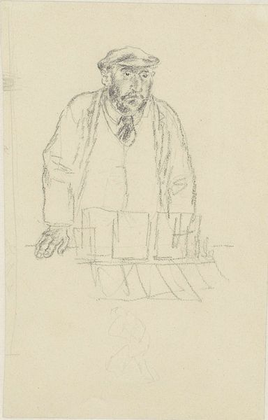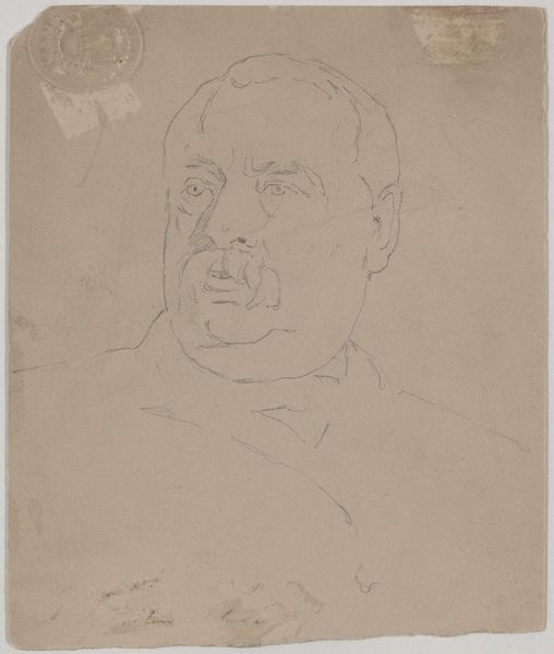 Editor: This is Jan Veth’s "Portrait of Tak van Poortvliet," sketched between 1874 and 1925, using pencil on toned paper. It feels very intimate, like a glimpse into the artist’s sketchbook. What do you see in this seemingly simple portrait? Curator: Well, let's consider the means of production. The use of pencil, a readily available and inexpensive material, speaks to a democratization of art-making. How does the choice of such a humble material impact our understanding of portraiture, traditionally associated with wealth and status? Editor: That’s a fascinating point. So, you’re saying that the accessibility of the medium challenges the elite nature of portraiture? Curator: Precisely! The sketch-like quality further emphasizes the process. The visible lines, the unfinished areas… They reveal the artist's hand, the labor involved in creating the image. How might this emphasis on process affect our perception of the sitter, Tak van Poortvliet? Editor: Perhaps it humanizes him. We see him not as an idealized figure, but as someone observed and rendered through the artist’s effort. Does the toned paper play a role too? Curator: Absolutely. Toned paper provides a middle ground, saving the artist time and material in the pursuit of specific atmospheric tonalities, shifting the artistic labor toward pure mark making.. What are your thoughts? Editor: That's brilliant. I hadn’t considered the social implications of something as basic as the choice of drawing materials. I suppose I had a very romanticized view of portraiture. Curator: And it’s through this materialist lens that we can question those romantic notions and uncover the hidden narratives embedded within the work. It helps us appreciate art not just for its aesthetic value, but also as a product of labor and social context. Editor: Definitely, it reframes the entire conversation. Thanks, this gives me a whole new perspective on how to appreciate art!