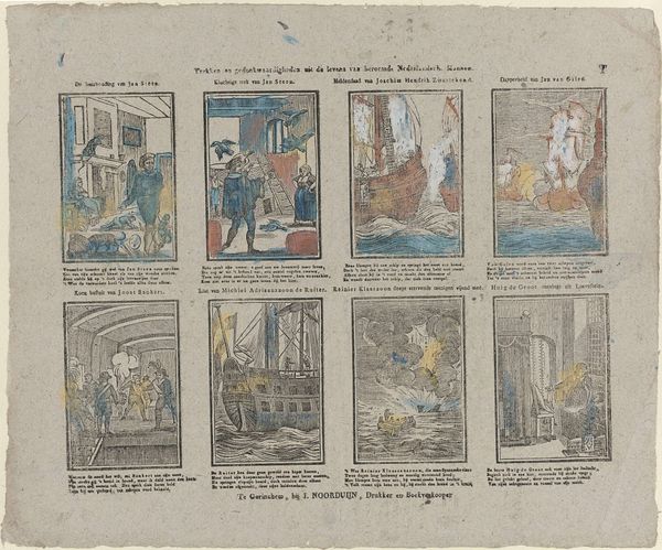 Editor: This is a print from the Rijksmuseum called "Ô lieve kindren! wie gy zyt. / Besteed met nut uw dierbren tyd (...)," made between 1791 and 1812 by Jacobus Thompson. It's an engraving in ink. I’m struck by the grid of little scenes, almost like a comic strip, and the slightly naive drawing style. What can you tell me about it? Curator: Well, immediately I'm drawn to the print medium itself. Consider the labour involved in producing multiple copies of this educational narrative. The etching process, the inking, the pressing... each step implicates a whole network of production and distribution. It makes you wonder about the social context: who was consuming these prints and how accessible were they to different social classes? Editor: So you're saying the *making* of the print, its physical production, tells us something important? Curator: Precisely. And the text too. Who decided that children needed these specific lessons, and how were these prints distributed among the populace? The interplay between image, text, and material execution offers a rich understanding of the period's didactic culture and emerging capitalist system. Notice that the publisher's information is printed directly on the piece, which, too, acts as another mode of marketing. It speaks volumes about the evolving market for such goods and the means of production in 18th-century Holland. Editor: It's fascinating to consider the print as a commodity, not just an artwork! I never would have looked at it that way. Thank you. Curator: Indeed, every object holds within it an embedded account of labor, and reflecting upon such dimensions reveals much that would otherwise be lost.