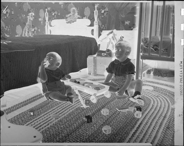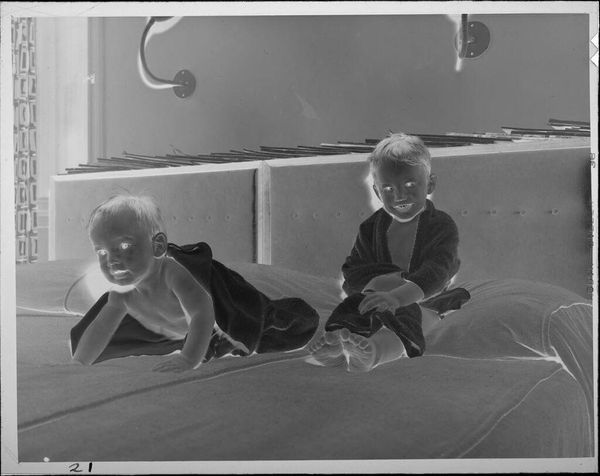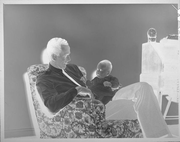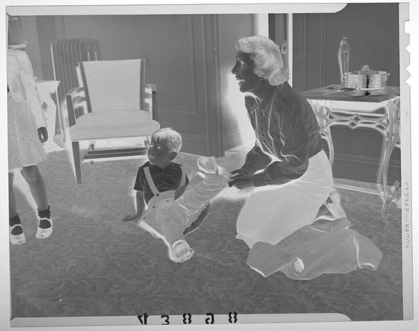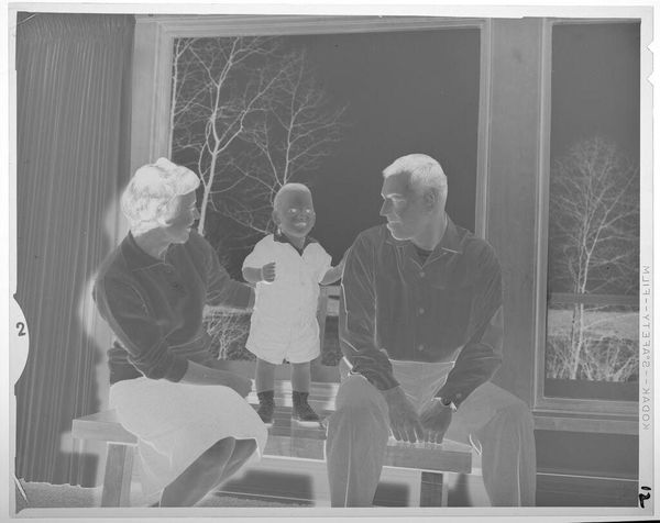 Editor: This is an untitled photograph by Lucian and Mary Brown, showing parents and a baby on a couch. The negative format creates a stark contrast, almost unsettling. What strikes you most about the formal qualities of this image? Curator: The inversion certainly challenges our perception. Note how the stark, almost skeletal trees outside press against the softer, curving forms of the figures within. The composition utilizes a strong diagonal, drawing the eye from the foreground couch towards the background window. What do you make of the light? Editor: It flattens the subjects, removing depth. Is that intentional, or simply a result of the photographic process? Curator: It could be both. The lack of chiaroscuro certainly emphasizes the graphic quality of the image. The forms become shapes, silhouettes against the contrasting ground, drawing our attention to their pure visual presence. I find the balance intriguing. Editor: I see that now. It seems that by focusing on forms, we are invited to look beyond the surface of a simple family scene. Curator: Precisely. The image transcends its subject matter, becoming a study in contrasting forms and the interplay of light and shadow.