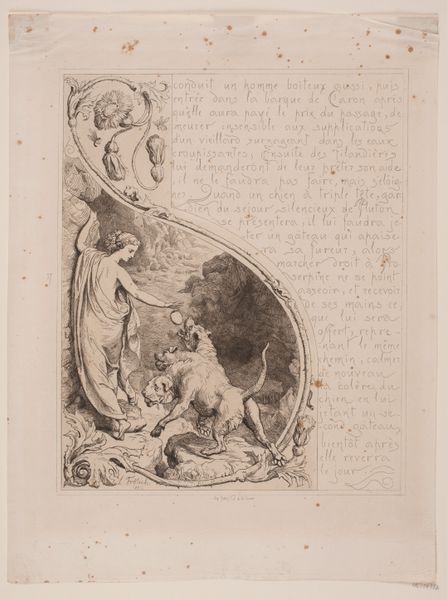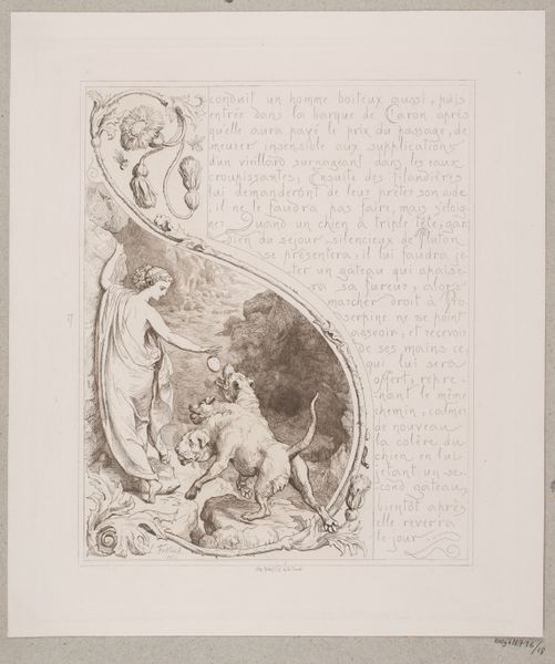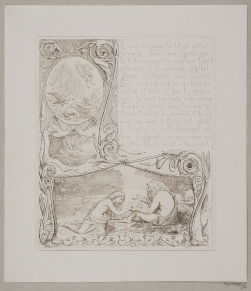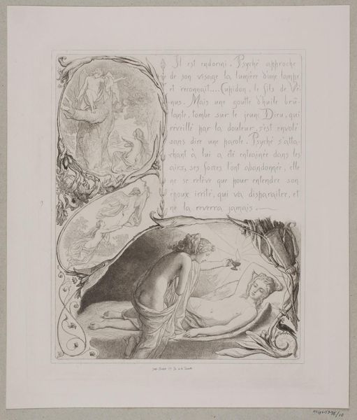 Curator: Let's delve into Lorenz Frølich's 1862 print, "Illustration nr. 16 til 'L`Amour et Psyché'," currently held at the SMK. Editor: This piece has a rather storybook quality. I am intrigued by the layering of different scenes, all encased within this ornate, almost thorny frame. How do you interpret this work? Curator: Well, from a materialist lens, I see a careful orchestration of labor and technique. Frølich's choice of engraving suggests a desire for reproduction, for disseminating this romantic narrative widely. Consider the social context: Who was the target audience for such prints, and how might their class background have shaped their reading of the Psyche myth? What kind of resources are required to have these materials at your disposition? Editor: I see, it is interesting to consider how this romanticized image relates to industrial methods of production! Curator: Indeed! This print complicates traditional boundaries between high art and craft. Engraving was a skilled craft, but it was also a process of mechanical reproduction, potentially challenging the uniqueness and aura of the artwork. Editor: So, the choice of printmaking is less about individual expression and more about wider accessibility. The frame itself, does that indicate social status? Curator: Precisely! Furthermore, the ornate frame – you rightly noticed it – highlights consumption. Its detail would be achieved through the labour of craftsmen whose material well being would be intrinsically related to the commission of this art. How does thinking about its production change your view of the image? Editor: It’s incredible to consider how materials and their use can change our view of art and its place in culture. Curator: Indeed. By focusing on the means of production, labor, and consumption, we move beyond simple aesthetic appreciation and enter a world of social and economic meanings embedded within the image.
