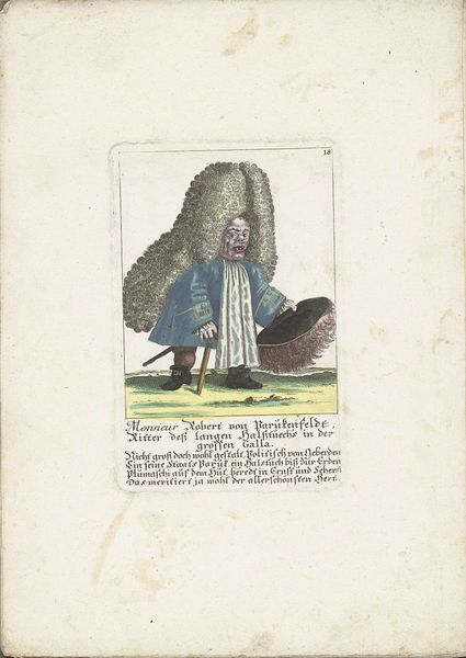 Curator: Welcome. We’re standing before "The Dwarf Monsieur le Marquis de Sauterelle," a whimsical etching produced by Martin Engelbrecht around 1710. Editor: Immediately, I'm struck by the figure’s exaggerated form – the large head dwarfing his tiny legs. There’s a clear imbalance; the color seems applied in a delicate way, almost tentative. It's interesting to compare it to the rigidity of the etched line itself. Curator: It’s certainly a caricature, but Engelbrecht seems to be saying something deeper about status and perhaps even self-perception. The Marquis, despite his physical stature, is decked out in elaborate finery, the wig becoming the dominant symbol of aristocratic identity. The text below includes a declaration written in period vernacular of the artist declaring himself “in love to madness”. Editor: I notice the flatness, the compressed space. Figures in the background seem almost pasted in, emphasizing the foreground’s isolation and highlighting the disjunction of scale. How do these deliberate distortions serve Engelbrecht's social critique? Curator: The print would have likely been circulated amongst the educated classes. The Marquis, as a grasshopper, becomes an absurd figure through whom courtly love itself, the game of appearance and social aspiration can be seen to reveal an important tension. He represents someone striving, in effect, to become someone else. In the context of the period’s evolving social structures, Engelbrecht’s Marquis embodies both the promise and the pretense that could enable social change. Editor: Perhaps the awkward perspective and uneven color contribute to the reading by creating a certain distance, a Brechtian effect of alienation… Curator: Possibly so. But the underlying appeal also seems connected to broader concerns about social performance and constructed identity that remain central to caricature even today. Editor: It's interesting how the close reading makes it appear even more intricate, highlighting the artist's intentions through its careful execution. Curator: Absolutely. Thinking about what symbols and ideals this funny little nobleman calls forth continues to illuminate the relationship between seeing and believing. Editor: Yes, the work gives one much to reflect upon after some close observation.