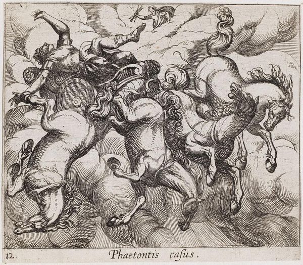 Editor: This is Antonio Tempesta's print, "The Greeks Battling the Trojans." The detail in such a small etching is amazing. How does the process of printmaking influence your interpretation? Curator: The etching reveals much about the means of production and consumption. Notice the dense network of lines; it suggests a mass-producible image, destined for a wider audience than, say, a unique painting. How does this impact its cultural value compared to other art forms? Editor: So, its value comes from being accessible and widely distributed? Curator: Precisely! The labor involved, the material—paper and ink—and the social context of disseminating classical narratives all become central to understanding its significance. Editor: That's a fascinating perspective, shifting focus from the battle itself to the making of the image. Thanks!