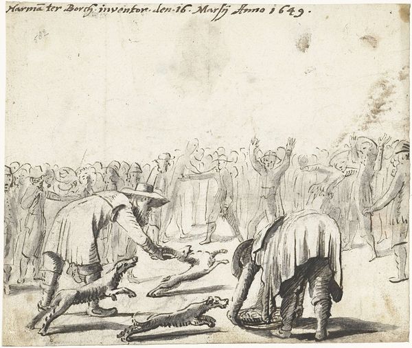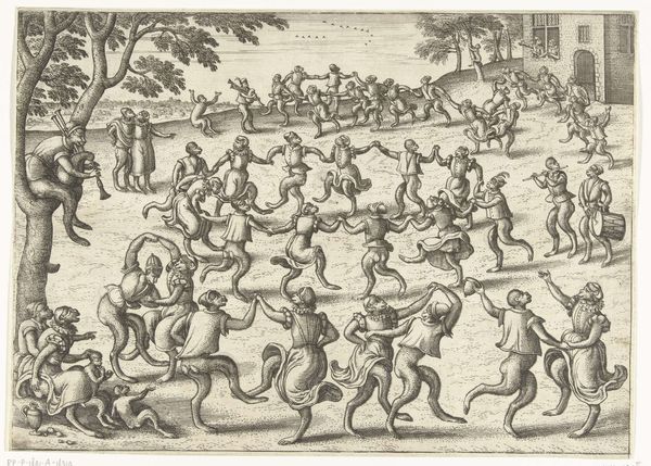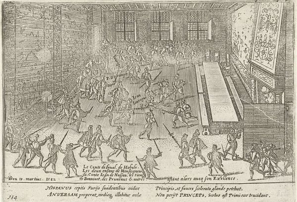 Editor: This is a print from between 1613 and 1615, titled "Executie van Salcedo die samen met Francesco Baza de prins van Oranje en de hertog van Anjou wilde vermoorden, 1582," now at the Rijksmuseum. The artist is anonymous. It's a rather gruesome depiction of an execution! All those figures packed tightly together create quite an unsettling feeling. How do you interpret this work? Curator: This image certainly carries the weight of its history. Think about the symbols being presented here – the horses pulling apart the body, the crowd as witness, the burning pyre… This isn’t just about depicting a gruesome event. The artist, even anonymously, has invoked a powerful language of public spectacle and the symbolic destruction of a traitor. Editor: So the arrangement is not only meant to show history, but has layers of meaning? Curator: Precisely! The image plays upon the anxieties of the time. Consider the period's religious and political upheavals. What does this spectacle of justice communicate about power, authority, and the consequences of treason? Notice how Salcedo is centrally placed but completely vulnerable. Editor: It’s a complete destruction of the person, beyond just death. Almost like a warning. Curator: Yes! That central placement, with all eyes on him, emphasizes the intent to publicly shame. Ask yourself, what purpose did these prints serve beyond documenting an event? Were they tools of propaganda, reinforcing the power of the ruling elite? Or a cautionary symbol of what happens if one commits such an act against power? Editor: I never considered it in that light before, the power of images being circulated as reminders. Curator: Visual symbols possess remarkable longevity. We must contemplate how this image might have resonated with audiences then, and even now, as we view its violent symbolism. Editor: I'll definitely look at images of this kind differently now, considering the potent symbols and how they spoke, and continue to speak, across time.