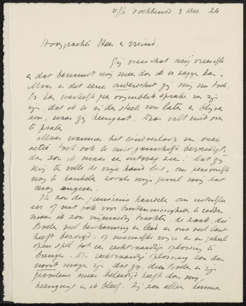 Curator: This intriguing artwork before us is a letter titled "Brief aan F.E. Posthumus Meyjes" created possibly in 1924 by Jan Veth. It is currently housed in the Rijksmuseum, and composed using pen and ink on paper. Editor: My first impression? Melancholy, almost ethereal. The delicate, flowing script dances across the paper, hinting at a deeply personal exchange. The paper itself seems fragile, as if touched by time itself. Curator: Indeed. Veth, who was a notable figure known for his portraiture and involvement in the Dutch artistic and literary scene, engaged here in a form of correspondence with F.E. Posthumus Meyjes, probably in regards to political matters. The choice of the medium, a simple pen and ink on paper, suggests an immediacy, doesn't it? It could be that his commitment to his work also shows the cultural conditions surrounding intellectual and artistic circles of the time. Editor: Absolutely! It feels unfiltered, straight from the artist’s mind. The letter's physical presence as a drawing feels so different than just reading text – you sense the very hand that penned these words. Curator: I agree, and we should note how the modernist style influences even something as commonplace as a letter. Its unadorned honesty and rawness really stand apart. Editor: And thinking of honesty, what do you suppose he intended when discussing delicate matters of potential "trouwe" and some sort of a political, I’d say, clash? The script almost veils certain meanings as if Veth struggled between what can be said, and what ought to remain unuttered. Curator: Precisely, that struggle to be both truthful yet cautious reflects a climate where certain viewpoints, even within intellectual circles, had to be navigated with care, so here Veth must carefully balance the importance of honest dialogues and possible counter narratives that existed at that time. Editor: Looking closer, I find myself wondering about Posthumus Meyjes, the letter’s intended recipient. Their relationship must have been complex, layered with trust yet perhaps also tinged with a quiet understanding of the potential for disagreement. It invites so much pondering on unwritten truths. Curator: It absolutely does. To close, I'd say the letter's importance resides not just in the explicit words, but in the contextual landscape they invoke, hinting to the struggles for ideological affirmation, a silent scream into the world's ear. Editor: I love that. For me, it's about seeing beauty in something so raw and unassuming. A beautiful dance of hidden and apparent ideas that ultimately connects us to the author through his creation.