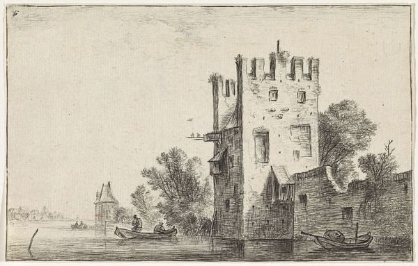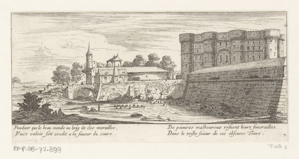 Curator: This is a delicate, detailed image attributed to Abraham Rademaker, dating sometime between 1725 and 1803, held here at the Rijksmuseum. It’s titled, "Gezicht op een deel van de stadwal te Utrecht, 1660"—a view of a section of the city wall of Utrecht. Editor: The image feels almost ghostly. There’s a faded quality that gives it an incredible sense of distance, both in time and in space. I'm also struck by how it appears to show a fortified structure being observed, watched over. Curator: Rademaker was known for his topographical drawings and prints, and his style frequently emphasized precise documentation of landscapes and urban spaces. It’s interesting how the details are carefully rendered, despite the softness of the line work. We're really given an excellent glimpse into this specific moment in Utrecht's past. Notice the way the artist captures light reflecting off the water. Editor: It certainly reflects an age where boundaries, literally walls, determined so much about the accessibility to power. We might reflect on who this fortified place was designed to protect and keep safe, and also conversely who it was built to keep *out.* The structure itself feels almost like a physical embodiment of social hierarchy, and perhaps Rademaker provides some critical observation. Curator: The walls definitely create a division and speaks to the urban development strategies in the region. I think it's less about critical reflection and more a capturing of a period. But perhaps our own positioning allows us to interpret them now through the lenses of class and safety you rightly bring to bear. And there's also a cultural memory at play here – how do walls shape the consciousness of people living within and outside of them? Editor: It’s fascinating how such a simple scene evokes those much bigger questions. A seemingly neutral depiction of a landscape still speaks volumes about its socio-political conditions and even carries forward symbolism into our present-day contexts. Thank you. Curator: Thank you.