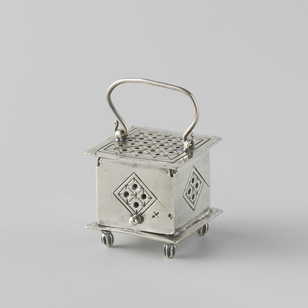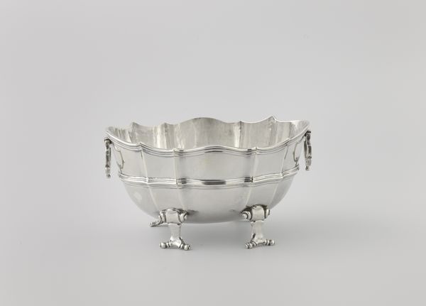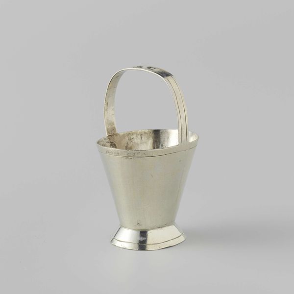 Curator: This delicate piece is a silver bonbon basket, crafted in 1812 by P.G. Tombrink. Notice its boat-like shape and intricate, openwork rim, characteristic of decorative arts from the baroque period. Editor: Immediately, it makes me think of fragile elegance. It’s so light and airy; you could almost imagine it floating on a cloud filled with pastel candies. But also, a ship? Perhaps it could also sail across a sea of sparkling sugar... Curator: Indeed, the “schuitvormig” – or boat-shaped – design gives it that nautical flair, fitting for the era. Beyond the charming silhouette, the structural rhythm, with its vertical bars intersecting horizontal lines, creates a captivating visual experience. What semiotic readings do you find particularly strong? Editor: Oh, structure aside, it also whispers stories of luxury and indulgence to me. Can't you just envision a lady delicately selecting treats at a ball? And the light! It's almost blinding, so bright you just want to put on shades! Imagine this piece catching light with every turn! It reminds me a bit of my grandmother’s jewelry box—shimmering nostalgia in object form. Curator: That shimmer highlights the object’s materiality, an intrinsic formal property that we can link to artistic intention. Here the medium is integral to the message. Editor: I suppose. In terms of technique and composition though, can you really say that about a bonbon basket? I like it's gleam. Pure bright surface... It invites your reflection. A little silver pond reflecting you back. Curator: The silver medium's reflective capacity plays directly into the era’s fascination with ornamentation and opulence; light was integral in reflecting power. Considering Tombrink’s skill, this speaks not only of luxury but the artistry to achieve this aesthetic so perfectly. Editor: True. In the end, beyond pure beauty, this bonbon basket opens the door to an era long gone, and how we appreciate fine silverwork—maybe not bad for a shiny little pond. Curator: Precisely; and through studying the artist's choices and compositional structures, such simple vessels reveal cultural, even socio-political complexities within our material past.
