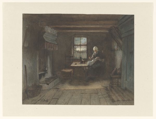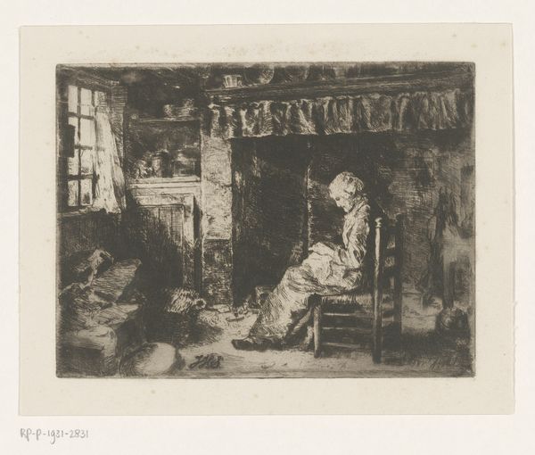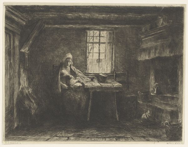 Willem Steelink made this etching, "Woman Watching Over a Sick Person," in the Netherlands in the late 19th or early 20th century. The image encapsulates the domestic sphere and the emotional labor often carried out by women. Note the dark interior and the woman hunched in worry, while another figure lays in bed behind her. The sparse furnishings and dim light suggest a modest, perhaps even impoverished, setting. The scene speaks to broader socio-economic conditions, reflecting on the everyday lives of ordinary people and the ever-present struggles with illness and hardship. Art historians can look at census records, social surveys, and medical reports of the period to understand the anxieties that are reflected in this artwork. The image reminds us that art is not just about aesthetics; it's a cultural artifact embedded in specific historical circumstances.