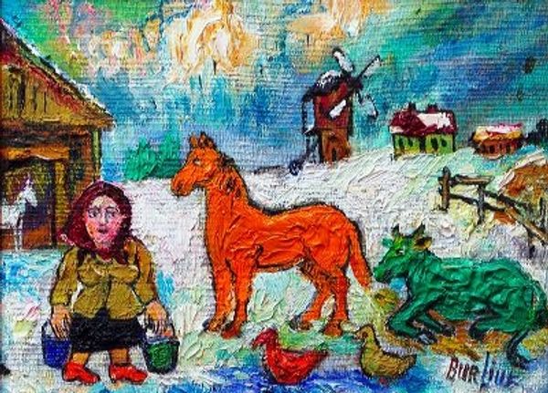 David Burliuk painted "Peasant Woman with Red and Green Cows" with oils, most likely in the early 20th century when he was developing his distinctive style. The vivid, unrealistic coloration and simplified forms connect it to the European avant-garde, but how might it also speak to Russian culture at the time? Burliuk was a key figure in the Russian Futurist movement, which embraced industrialization and radical social change. But here, we see a peasant scene, seemingly far removed from urban factories and political manifestos. Perhaps Burliuk is reimagining rural life through a Futurist lens, imbuing it with the energy and dynamism of the modern world. The bold colors could also be a commentary on the traditional, often romanticized, depictions of peasant life in Russian art. To understand this painting fully, we can research Burliuk's biography, the Futurist movement, and the broader social and artistic context of early 20th century Russia. Only then can we grasp the full meaning of this seemingly simple scene.