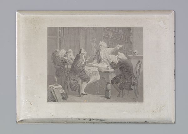 Editor: So, this is "Skandinavernes hjælpekasse i Rom," or "The Scandinavians' Relief Fund in Rome," an engraving from 1878. The print work is really detailed, capturing the clothing textures so well. What stands out to you? Curator: Well, focusing on the materials, let’s consider why an engraving, a process of making multiple reproductions, was chosen. It wasn't about creating a unique object. Instead, its strength lies in the broad distribution of this image. The “relief fund” box at the center seems to suggest anxieties around poverty and social mobility. Editor: So, you're suggesting the material choice emphasizes accessibility and distribution related to wealth? How does the context of the production relate to the subject matter? Curator: Exactly. This print isn’t just showing us a scene; it's also participating in a larger system of resource management. The “Scandinavian Relief Fund” surely served specific, probably class-based, groups of artists abroad. We see consumption meeting production, with these characters literally “paying” for their continued work in Rome. Does that shift how you see it? Editor: It really does! Thinking about how the image circulated gives it a completely different meaning, seeing it less as a record and more as an element of how resources moved through a particular community. Curator: And think about the engraver's labour itself – painstaking, precise work to produce an image meant to generate… what kind of return for that labour, exactly? It points to many different hands in this “relief.” Editor: Right, all that labor just to get a little back? Thanks, it's insightful to think about beyond the aesthetic value of this piece.