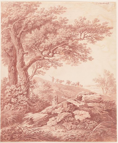 Editor: This is Gaspard Dughet's "Road Through a Wooded Landscape." It is a brown wash on paper, giving it this aged quality. What strikes me is how the road and trees create a dynamic composition. What do you see in this piece? Curator: I’m drawn to the materiality of the wash itself. The artist's choice of medium speaks to accessibility and portability. Considering the social context, was this meant for personal study or perhaps as a preliminary sketch for a larger, commissioned landscape? The very act of production, the physical labor, becomes central to understanding its purpose. Editor: That's a great point! It shifts the focus from just the scene to the artist's process. Curator: Exactly. We can consider the cost and availability of materials, which reflect the economic realities of the time. Thinking about it in this way really grounds the artwork. Editor: I hadn't considered it that way before; I was too focused on the aesthetic appeal. Curator: By considering the materials and means of production, we unearth deeper layers of meaning.