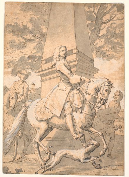 Marcus Tuscher rendered this drawing of a nobleman and his retinue with pen and brush. The scene is dominated by the obelisk. This symbol, reaching skyward, represents not only power and permanence but is also a visual echo of ancient Egyptian aspirations of immortality. The obelisk is rooted in antiquity, and yet it re-emerges here in 18th-century Europe, a testament to cultural memory. Consider how the Egyptian pharaohs used these monolithic forms to assert divine authority; here, it serves as a backdrop, subtly amplifying the nobleman's status. The very act of erecting obelisks speaks to a deep-seated human desire to transcend mortality. The emotional weight of such symbols cannot be overstated, engaging viewers on a subconscious level with themes of power, legacy, and the eternal. This cyclical progression demonstrates how symbols resurface, evolve, and take on new meanings, continuously shaping our cultural landscape.