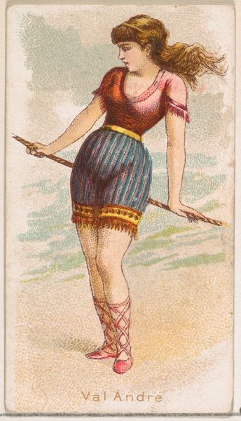 Editor: This is a promotional print from the "Sports Girls" series, dating between 1885 and 1895, put out by the American Cigarette Company to advertise Gloria Cigarettes. The player, in her rugby gear, is raising the ball high, looking pretty pleased with herself! It’s fascinating how this small image, intended as an advertisement, now resides in the Met. What strikes you most when you look at it? Curator: The prominent placement of women within popular imagery is indeed fascinating. Here, she occupies a space normally reserved for men. The athletic woman holding the ball becomes a symbol of burgeoning female empowerment but subtly coded, right? It sells cigarettes by selling a progressive ideal, yet contained and consumable, like the cigarette itself. Editor: So you’re saying that she stands for both liberation and conformity at once? Curator: Precisely. Note the idealization of the female figure; she is presented with a fashionable silhouette instead of being rendered in a purely athletic manner. The sporting attire is thus both empowering and performative. Do you notice the background's pastoral scene in juxtaposition with this athletic figure? Editor: I do now, and I think that adds to that tension of freedom versus confinement you're speaking about, contrasting modern sports with idealized nature! Curator: And that tension becomes the very image the consumer buys into when purchasing their cigarettes. We are left pondering, who is she, and what are the symbols that resonate with cultural memory, especially as this image fades on toned paper, echoing within our modern lens? Editor: I never thought about it that way; I was initially stuck on how overtly sexualized it was. Thanks, that gives me something to think about. Curator: And that initial observation is also completely valid, furthering our ever evolving reading of image-making within society.