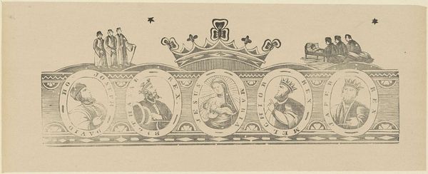 Editor: This is "Driekoningenkroon" by Erve H. Rynders, dating from 1831 to 1854. It’s a print – I think it might be a woodcut or engraving? The figures and stylized shapes give it a very medieval feel. What do you see in this piece? Curator: I see a fascinating interplay of line and form. Note the stark contrast between the black ink and the white paper, creating a powerful visual impact. The artist's strategic use of hatching and cross-hatching defines the figures within the oval frames, lending a sense of depth. Do you observe how the geometric patterns above, almost like a frieze, echo the shapes within the portraits, binding the entire composition? Editor: Yes, I see what you mean. The shapes at the top almost look like simplified crowns. Do you think that was intentional to add a formal structure? Curator: Indeed. These repeated motifs establish a rhythm and order, guiding the viewer's eye across the print. Furthermore, consider the materiality of the piece. As an engraving or woodcut, the incised lines possess a tactile quality, hinting at the labor-intensive process of its creation. The limitations of the medium become aesthetic strengths. What is your take? Editor: It’s so interesting to consider the artistic choices forced by the printmaking process itself! I focused on the subject matter initially, but I see that the materials are just as vital to its effect. Curator: Precisely. By understanding the interplay of form, line, and materiality, we unlock deeper meanings within the artwork, enriching our overall experience and understanding. Editor: I’ll definitely look at prints with fresh eyes now! Thanks so much!