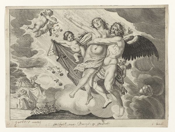 Dirck Volckertsz Coornhert created this print, Laatste Oordeel, whose date is unknown, using engraving. Coornhert lived during the Reformation, a time of religious upheaval that significantly influenced his artistic output. The print depicts the Last Judgement, a scene laden with anxiety and hope, reflecting the intense spiritual debates of the 16th century. God is enthroned, looming over naked figures who writhe in anguish, illustrating a moment of reckoning and the stark division between salvation and damnation. Coornhert's own humanist beliefs and advocacy for religious tolerance shine through. The emotional intensity of the figures invites us to contemplate our own moral standings. Rather than strictly adhering to traditional representations of divine judgment, Coornhert infuses the scene with a palpable sense of human vulnerability, questioning the rigid doctrines of his time. This engraving pushes us to consider the intersections of faith, justice, and personal responsibility, mirroring the deeply personal and societal struggles of the Reformation era.
