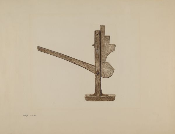 Editor: Here we have Gerald Transpota’s "Bridle Bit," a pencil and graphite drawing from around 1936. What strikes me is the almost scientific precision with which he renders this equestrian tool; it feels part diagram, part portrait. What do you see in this piece? Curator: Indeed, there's a tension here. It presents itself as objective, almost technical in its draftsmanship. Yet, consider the bridle bit itself. It’s a symbol, not just of control, but of partnership, the delicate balance between human and animal will. We’ve been using similar objects to direct horses for millennia. Does the precision hint at mastery or something more nuanced? Editor: So, you’re saying that it isn’t simply a depiction of a functional object? That the very image of the bridle bit carries this long history within it? Curator: Precisely! Think of how horses have shaped our cultures. From agriculture to warfare, their control was often power. The ornamentation—the delicate floral patterns, the meticulously crafted segments—these elements suggest a reverence. What emotional weight do these details evoke for you? Editor: I see how it almost elevates the bit. I hadn’t really considered it as more than just what it is... Curator: Consider that rendering also creates an afterlife for objects. We see it now, removed from function, but very present as something evocative of human ingenuity and an enduring connection with animals. What we see are vestiges of older symbolic meanings, and hints to more personal memories for those who may recognize and connect with similar objects. Editor: I never thought an illustration of a bridle bit could hold so much history and meaning. Thanks! Curator: A fresh perspective is always insightful! It reminds us that even the most utilitarian objects carry a complex story waiting to be revealed.