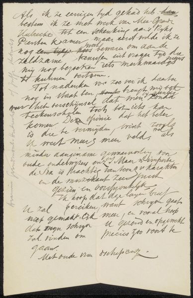Editor: Here we have "Brief aan anoniem," or "Letter to Anonymous," possibly from 1914, by August Allebé. It's an ink and pen drawing, and I have to say, there's something incredibly intimate and mysterious about reading what appears to be a personal letter rendered as a work of art. What catches your eye in this piece? Curator: It’s interesting that you use the word “intimate.” As a historian, I consider how this letter exists within the broader context of art institutions. This isn't just a personal note; it's in the Rijksmuseum, making it a public document. Editor: I see what you mean! I hadn’t really thought about it that way, more about the writing being made public. Curator: Precisely. We can explore who was considered important enough for their private correspondence to become a matter of public interest. Consider the time: possibly 1914, right before World War I fully engulfed Europe. How might the looming anxieties of war influence Allebé’s perception of the letter's message? Editor: That makes a lot of sense! So, you're saying it's not just about the individual letter itself, but also the historical context of the time that is important. I hadn’t considered the societal context. Curator: Exactly. And further, the very act of preserving such writing can tell us about how historical and artistic narratives are selectively assembled by museums and other institutions. We have to acknowledge our biases in determining which writings get spotlighted. Editor: So, it prompts us to ask, "Why this letter, and not others?" Fascinating. Curator: Precisely. It also highlights the politics of whose stories are being considered important. We shouldn’t consider what’s physically in front of us but why we find it interesting. Editor: I see. I've learned that considering art involves historical context as well as considering institutions and politics. Thanks so much.