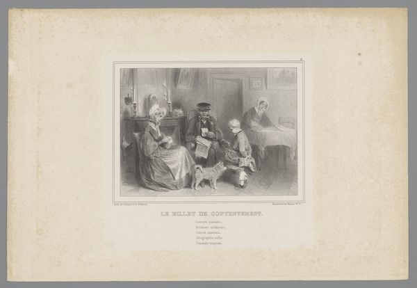 Curator: This is Auguste Raffet’s lithograph, "The Report of Contentment." Editor: It gives off an air of domestic tranquility, doesn't it? The composition is carefully arranged, drawing the eye to the reading man. Curator: Precisely. This scene plays upon a long tradition of the idealized family. The father reading signifies education and authority. Editor: But note how the light is distributed. It softens the father’s authority by equally illuminating the figures, thereby reinforcing a sense of collective contentment. Curator: And the dog—a symbol of loyalty—further affirms this mood. It's a visualization of bourgeois values. Editor: Raffet's careful use of cross-hatching creates subtle gradations in tone, which enhances the realism. It’s a well-constructed emotional tableau. Curator: It is a potent image. This little vignette reflects the values that society held dear, offering us a glimpse into their cultural memory. Editor: Indeed, a valuable insight into their visual language.